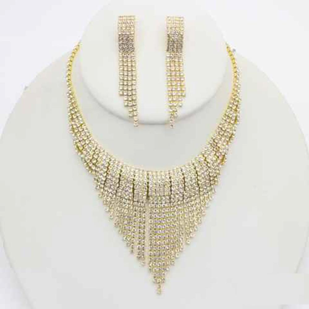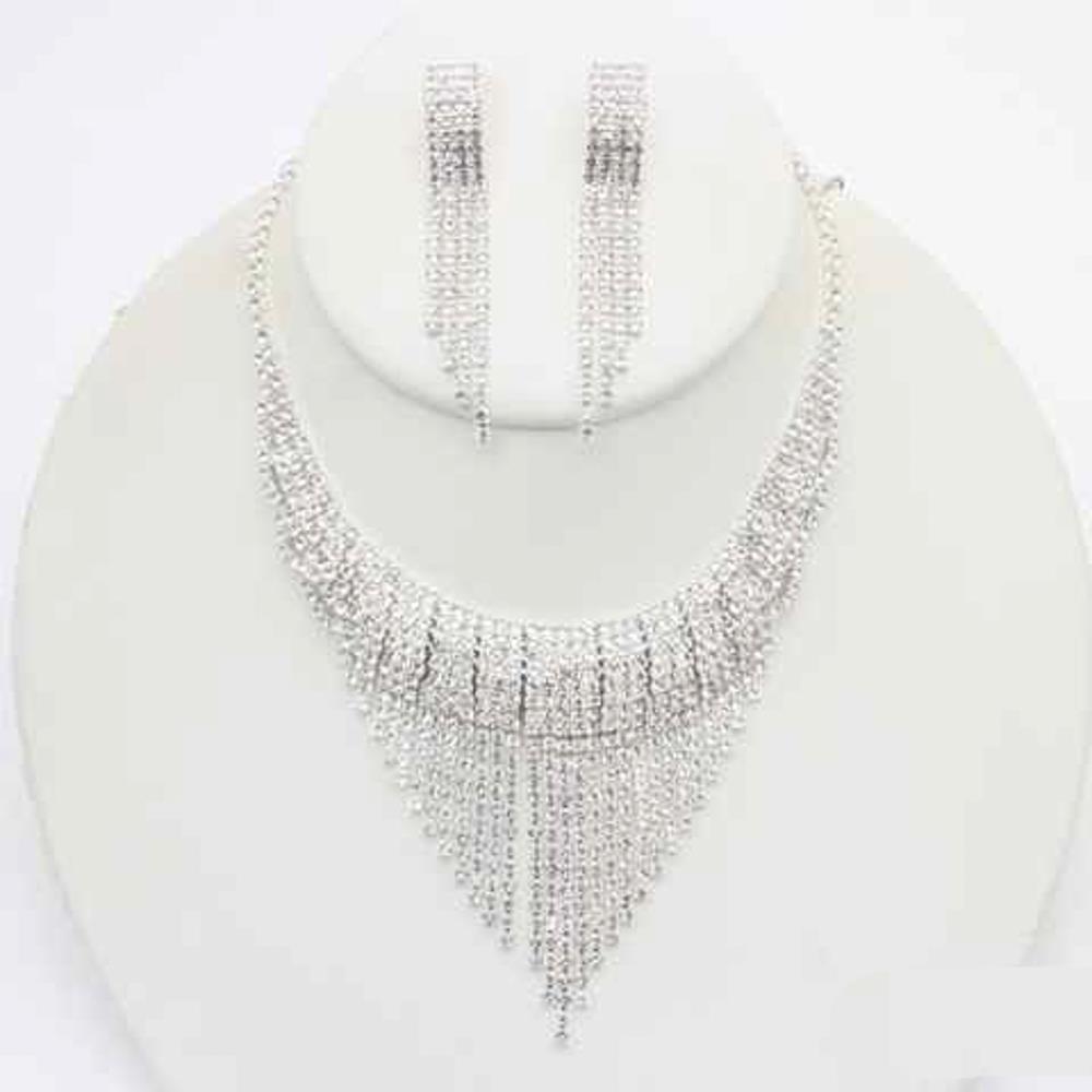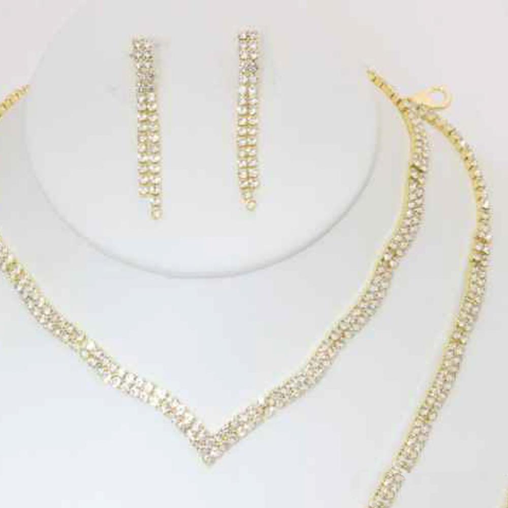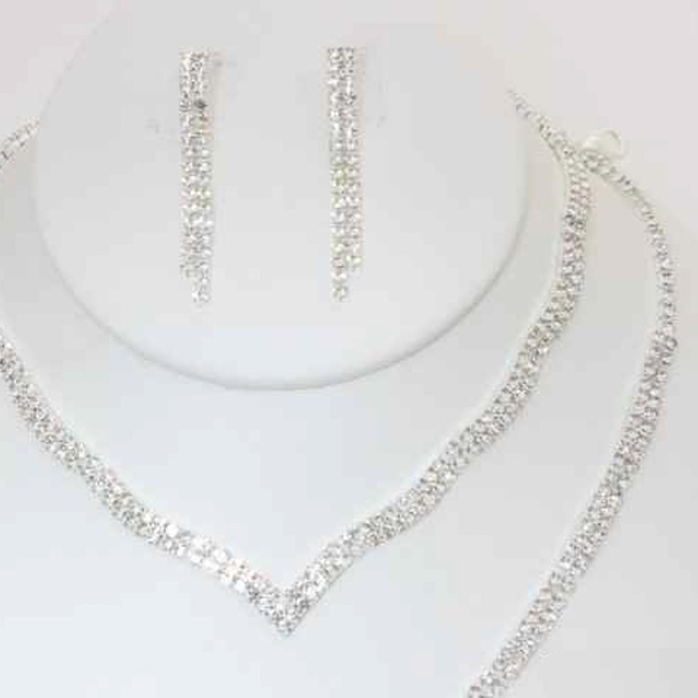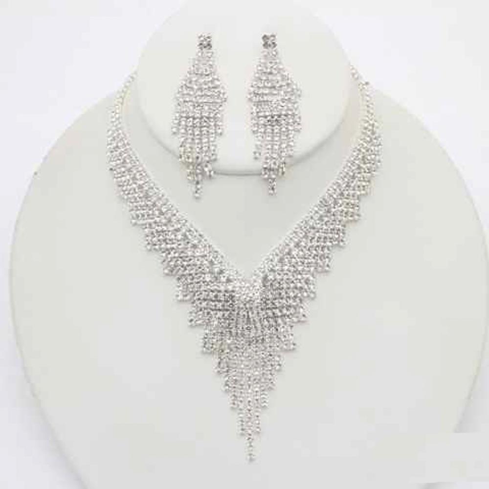 RHINESTONE MULTI ROW LAYERED V SHAPE NECKLACE EARRING BRACELET SET