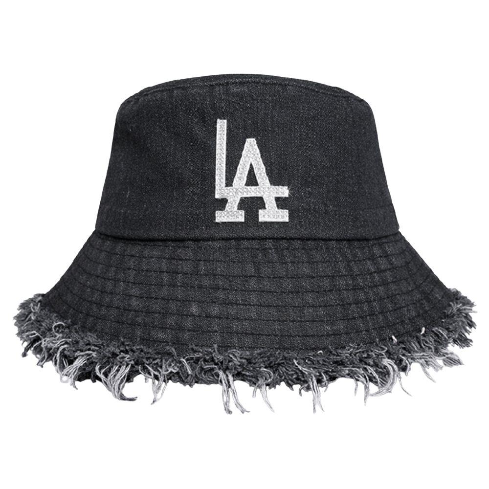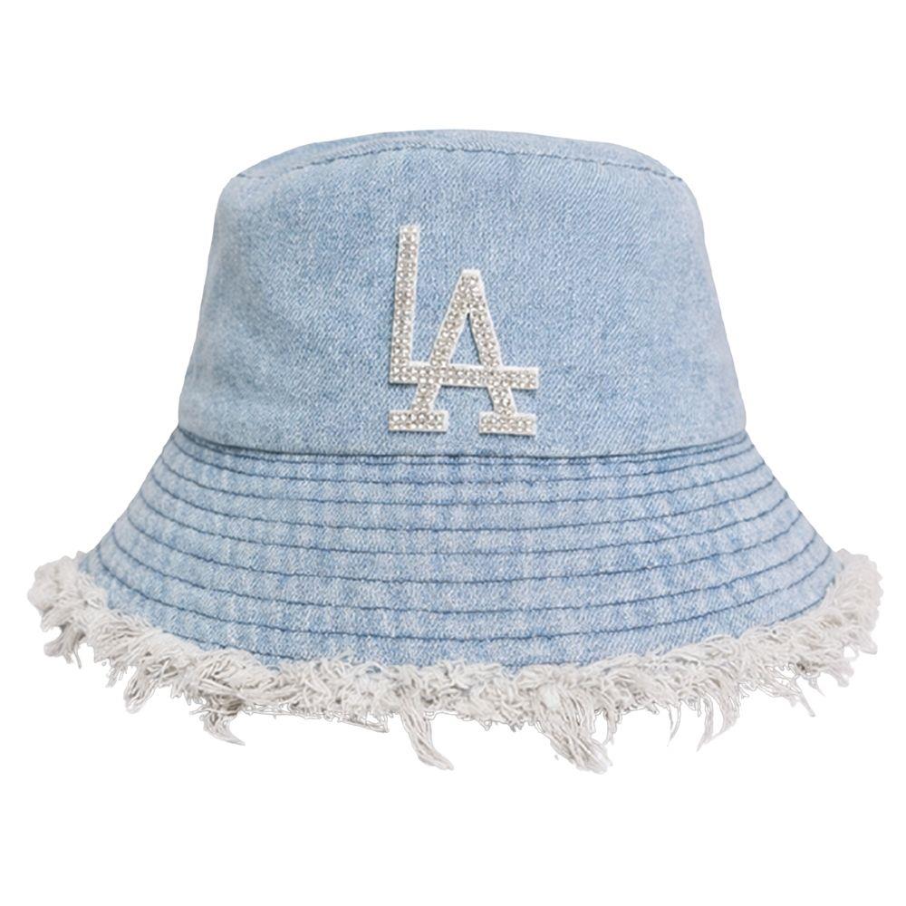 FRAYED EDGE VINTAGE WASH DENIM ADJUSTABLE STRAP BUCKET HAT W DRAWSTRING