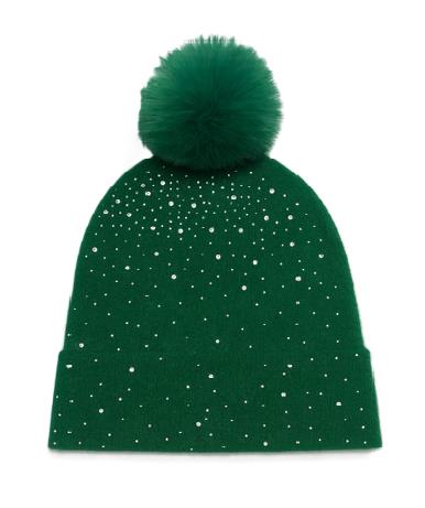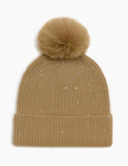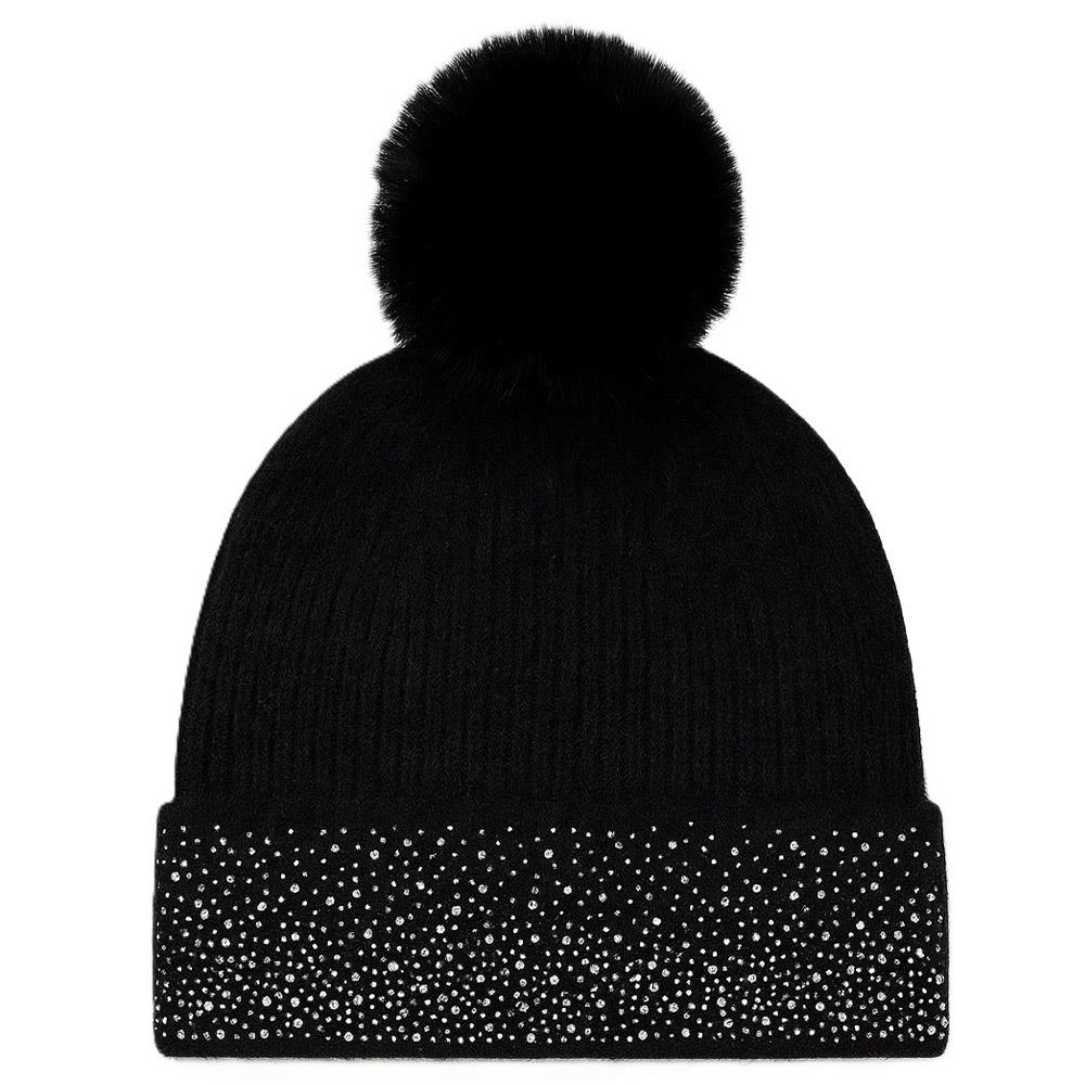 KNIT BEANIE WITH RHINESTONE TRIM AND FAUX FUR POM POM