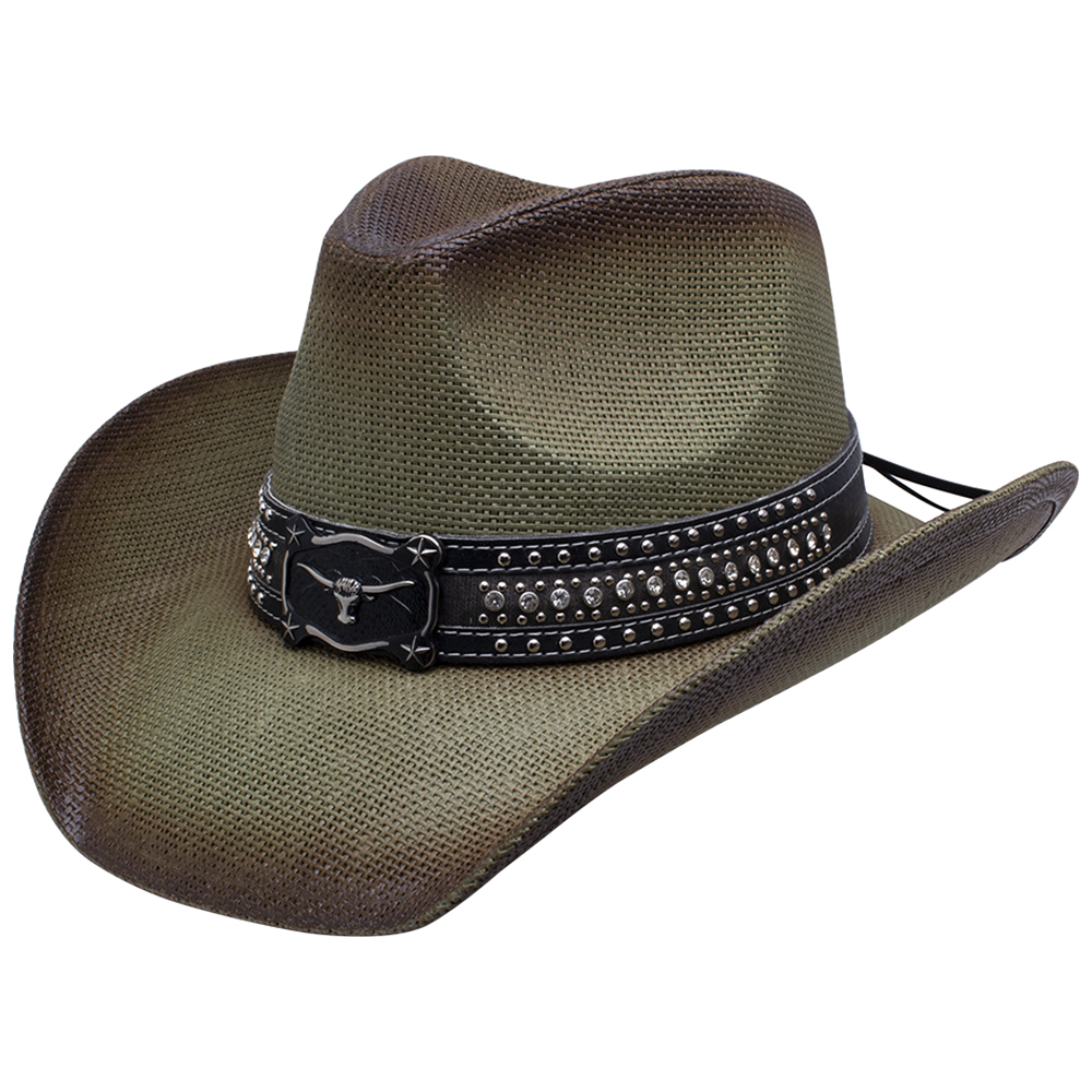 AGED LOOK, STRAW COWBOY HAT WITH SUEDE STITCHED DETAILS AND STEER HEAD CONCHOS
