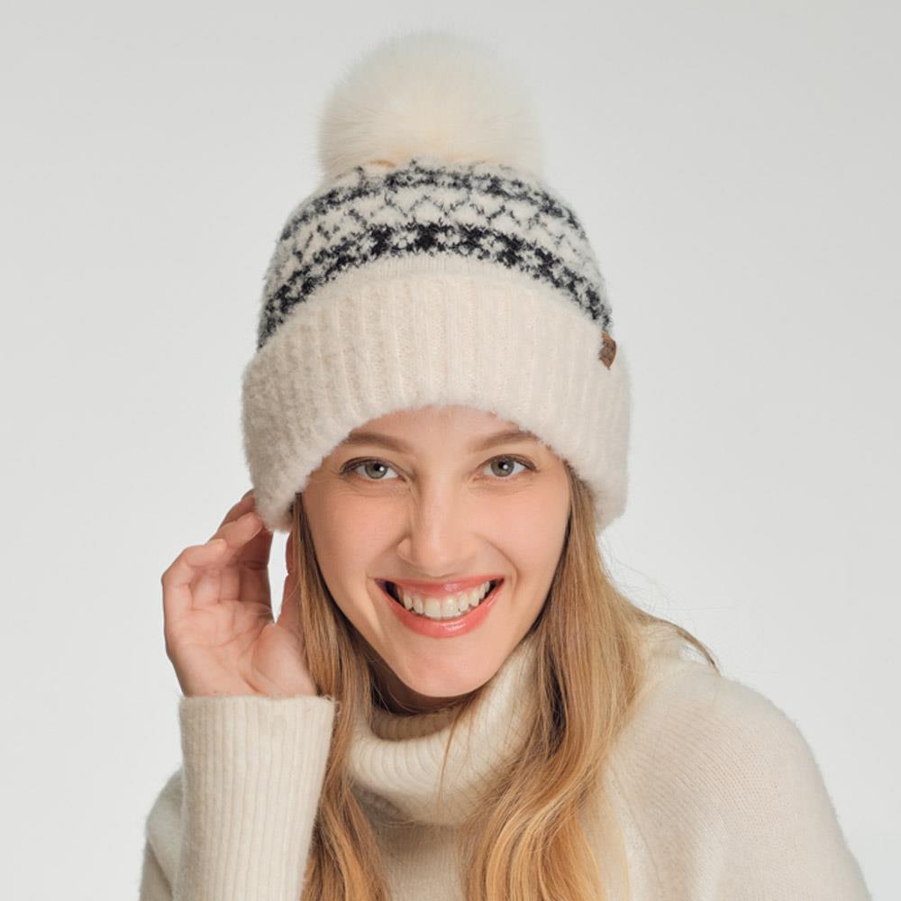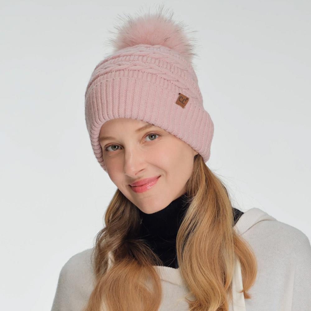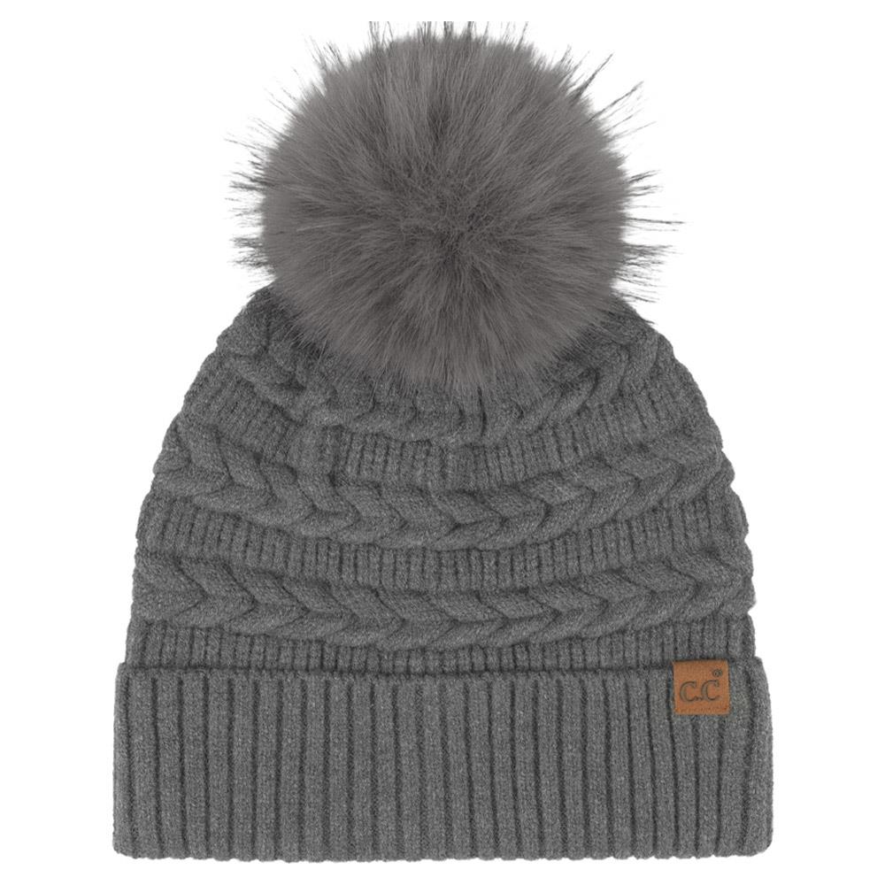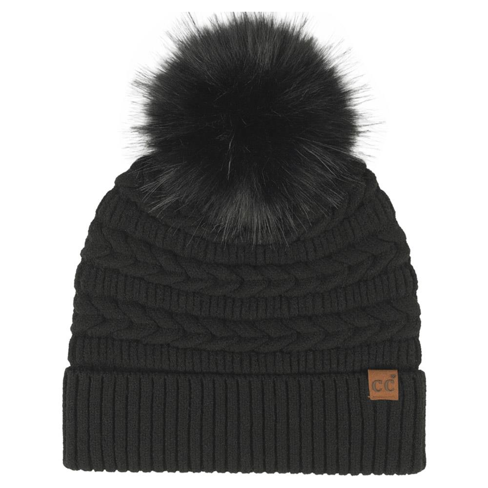 CC BRAIDED PATTERN FAUX FUR POM BEANIE