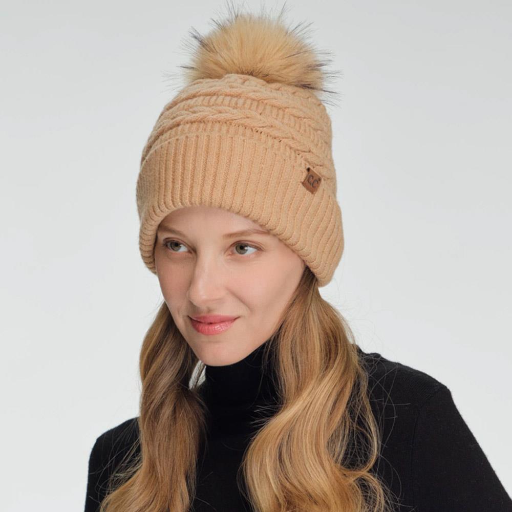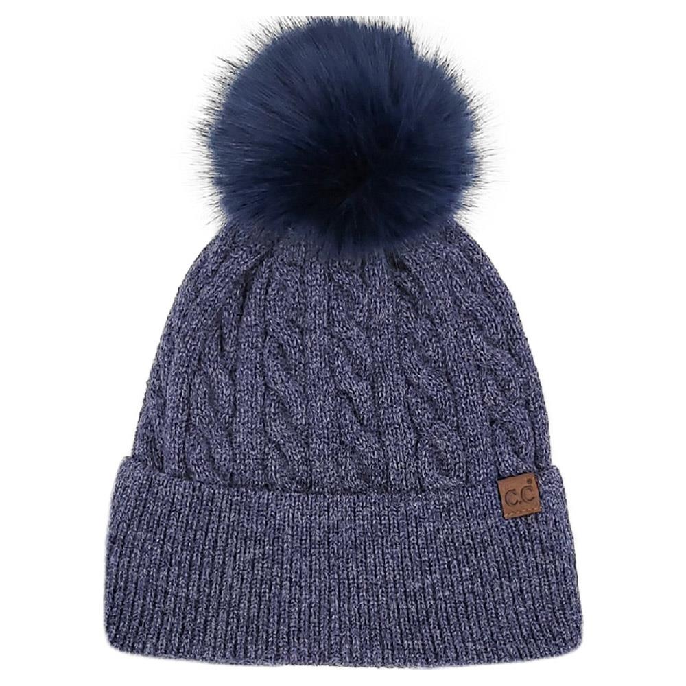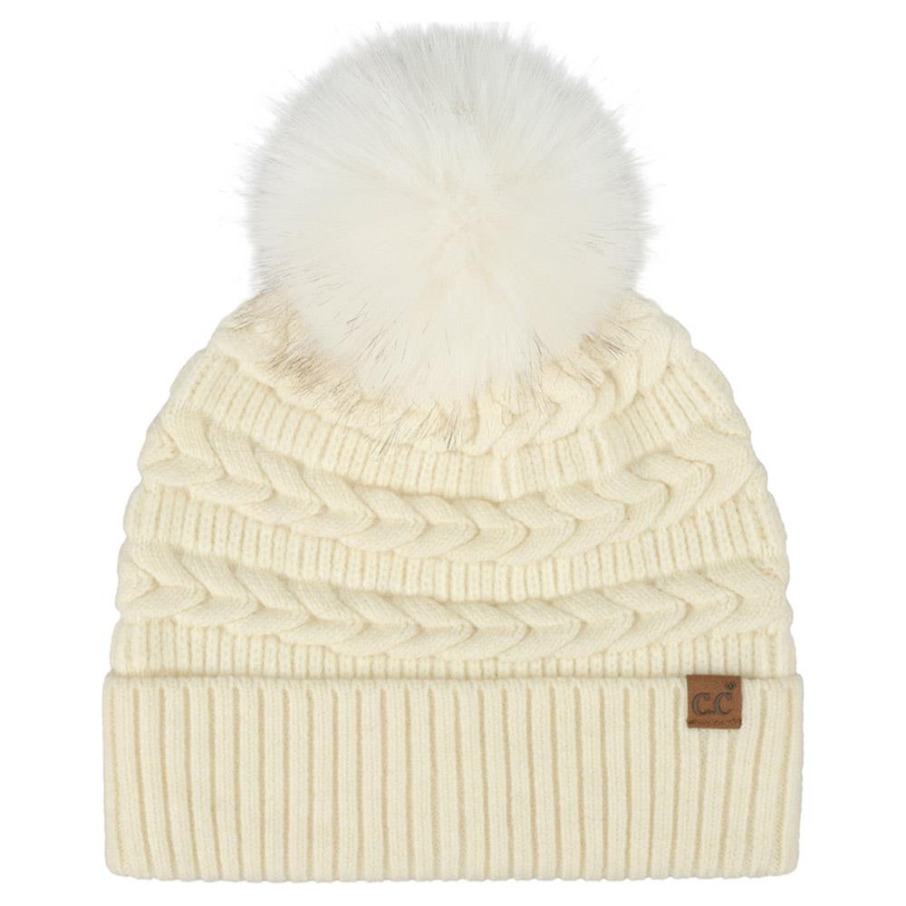 CC CABLE KNIT FUR CUFF POM BEANIE