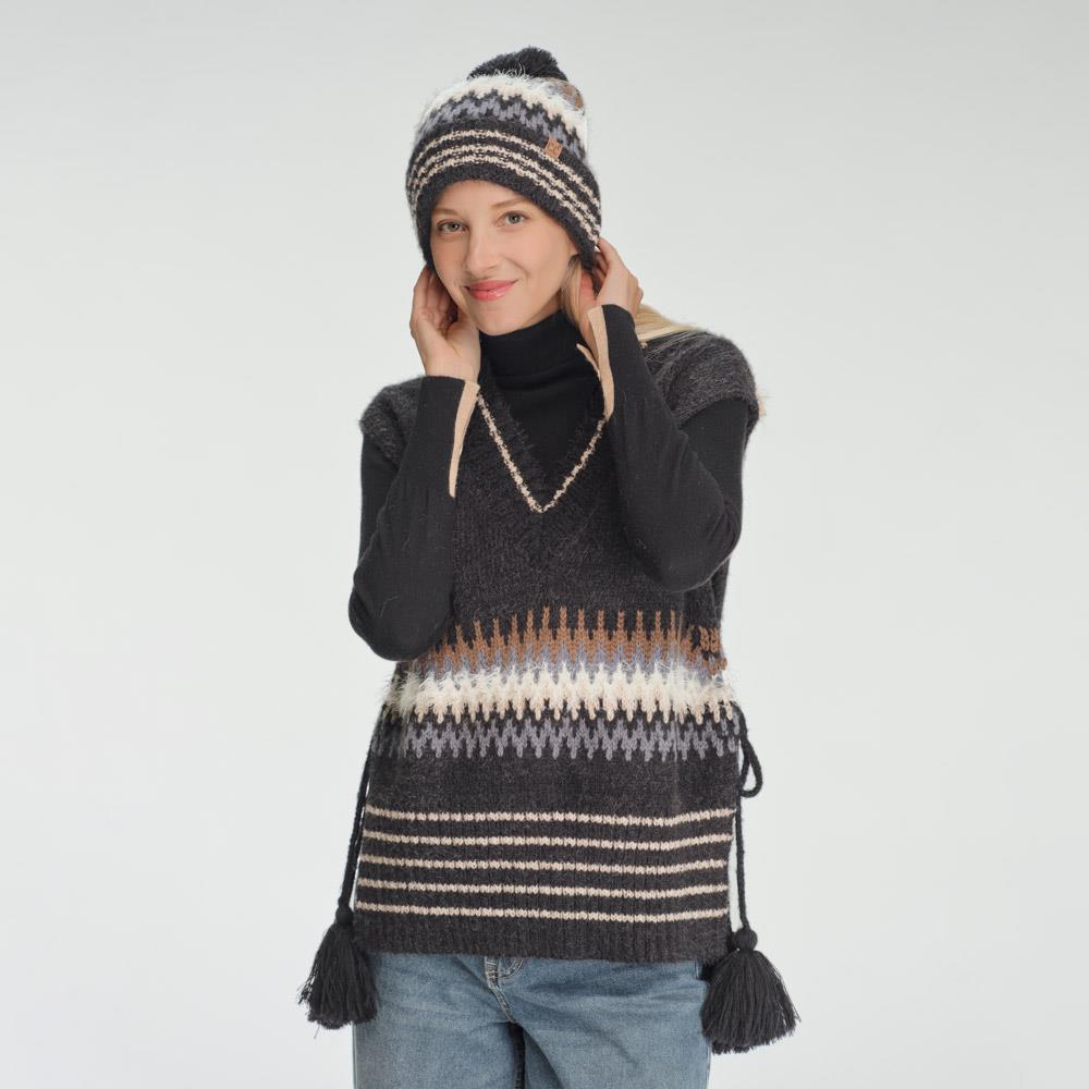 CC GEOMETRIC PATTERN KNIT BEANIE WITH MULTI COLOR YARN POM POM