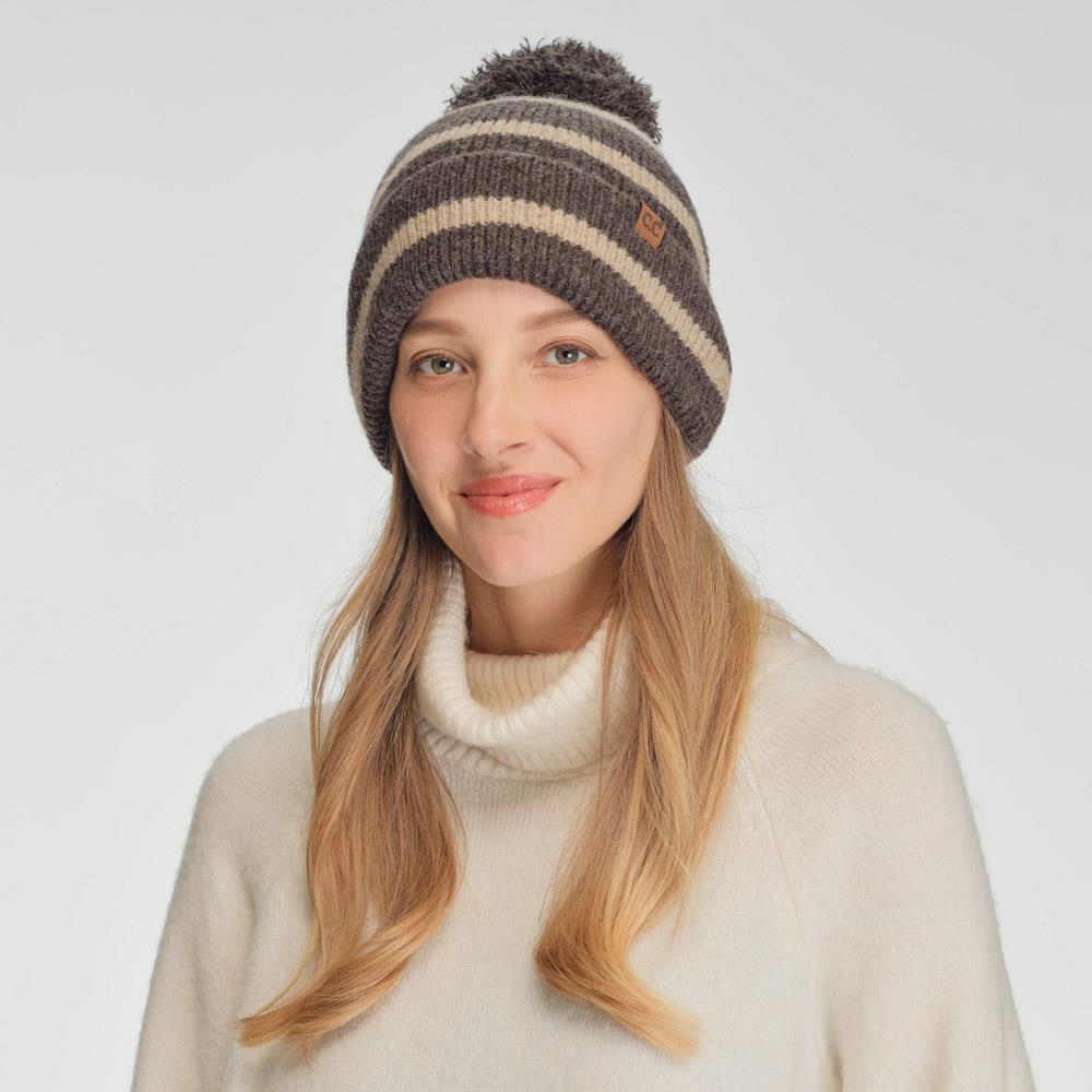 CC NEUTRAL HORIZONTAL STRIPE CUFFED POM BEANIE