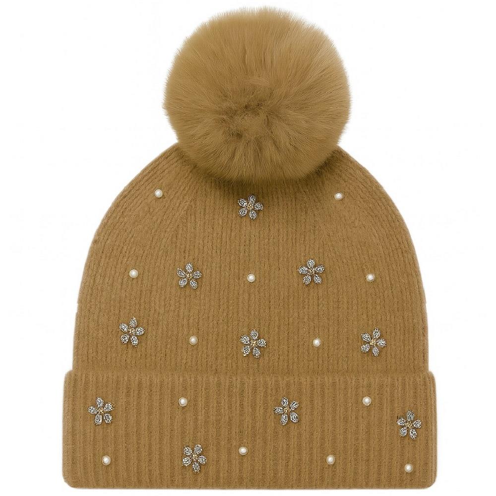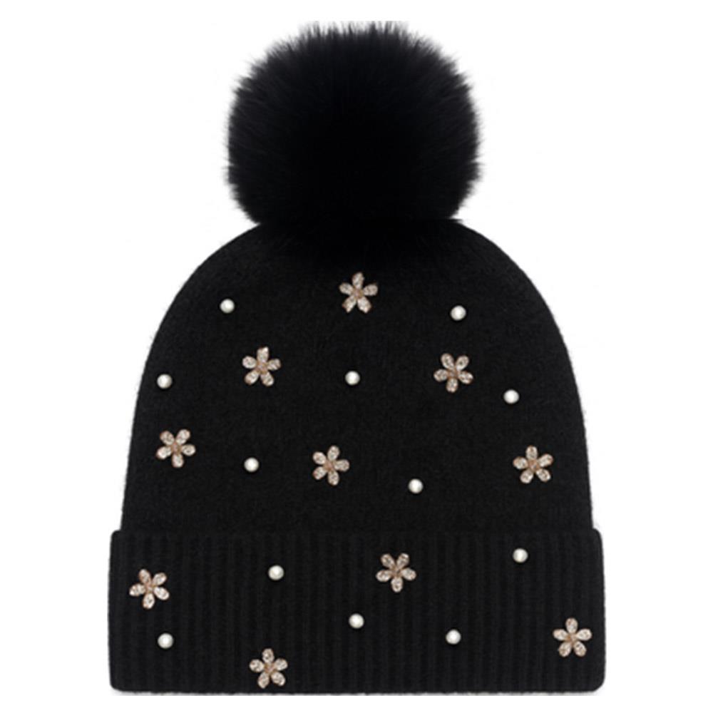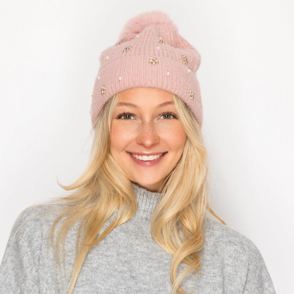 PEARL RHINESTONE FLOWER WITH POMPOM BEANIE