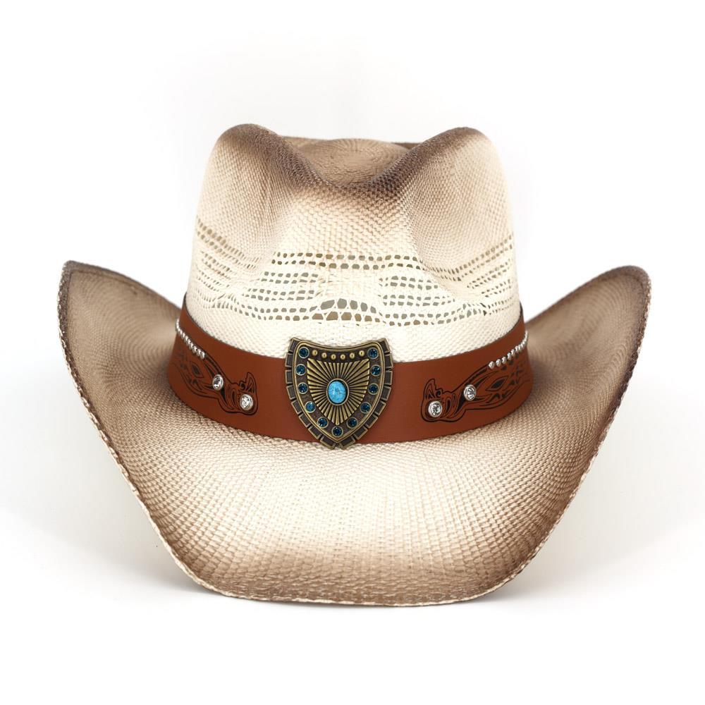 WESTERN STRAW COWBOY HAT WITH TURQUOISE STONE CONCHO AND BULL EMBLEM BUCKLE BAND