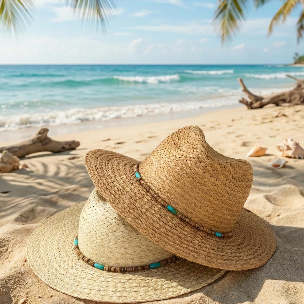 STRAW FEDORA HAT WITH TURQUOISE STONE BAND