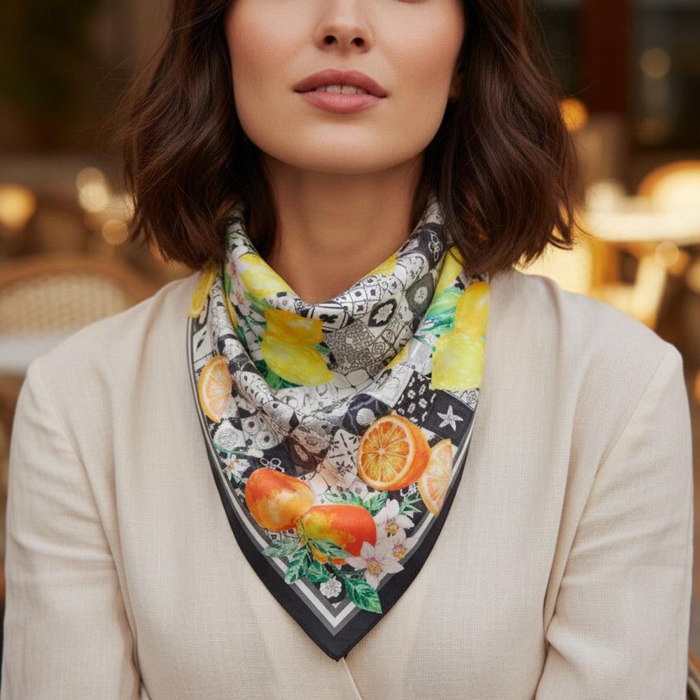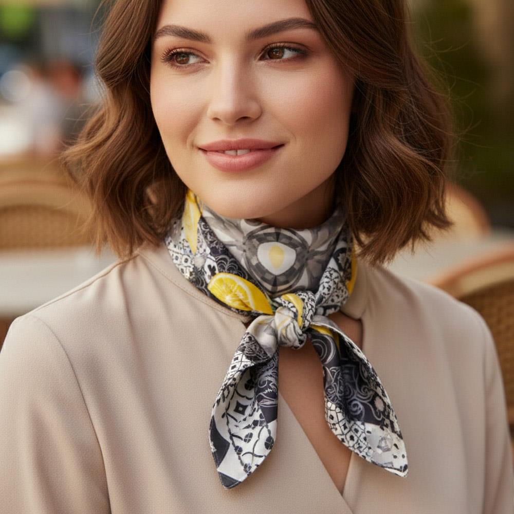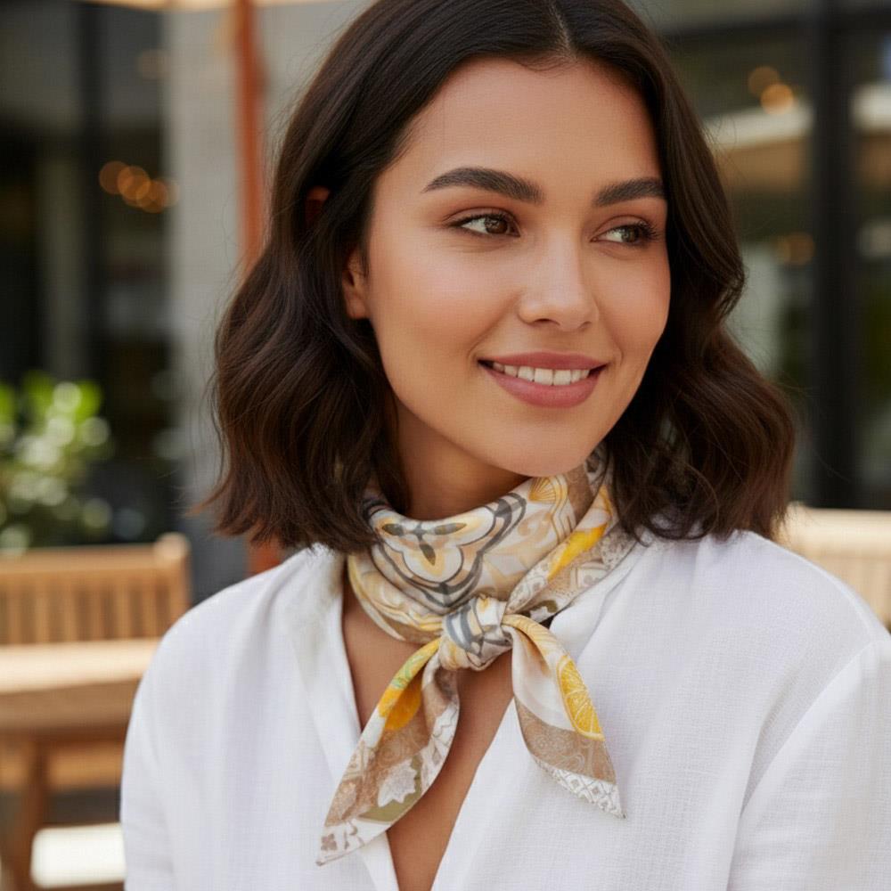 SCROLL GRAPHIC PANEL PATTERN SILKY BANDANA SQUARE NECK SCARF
