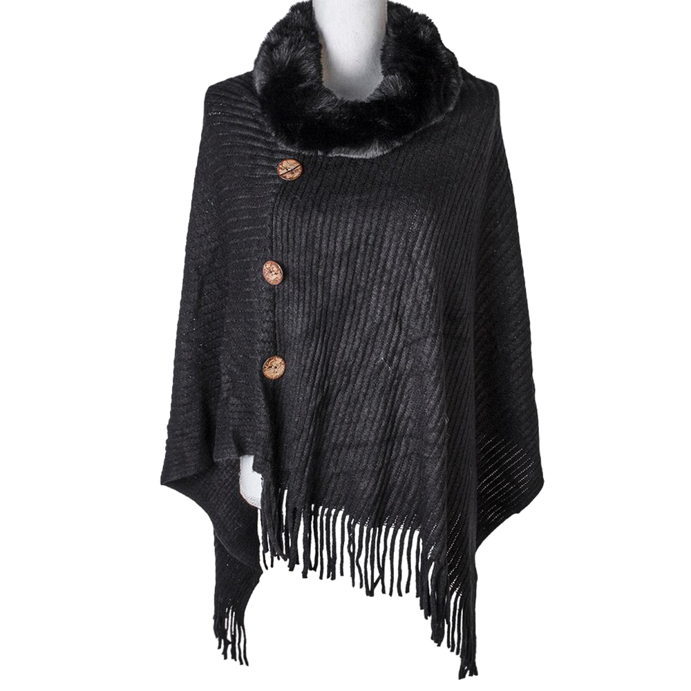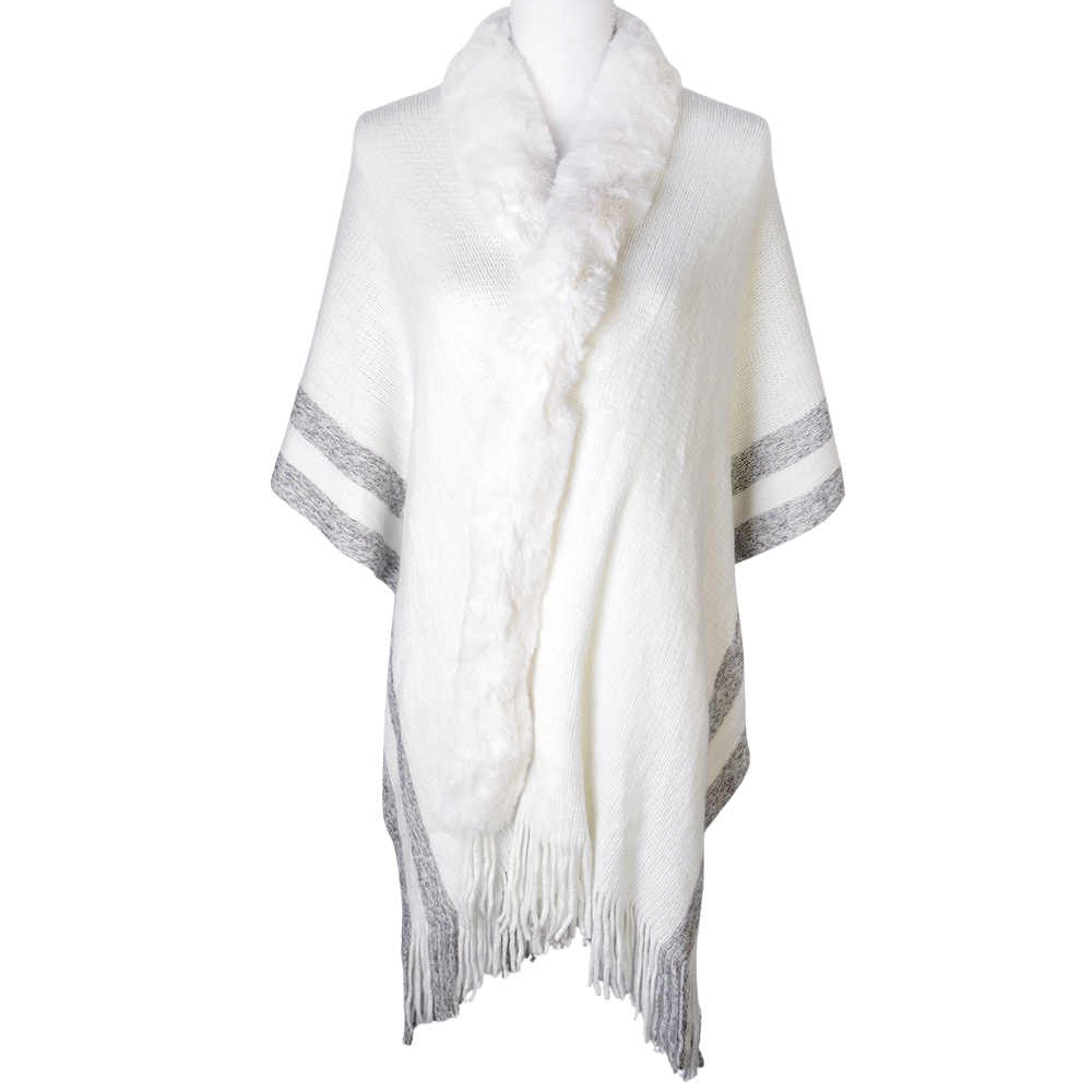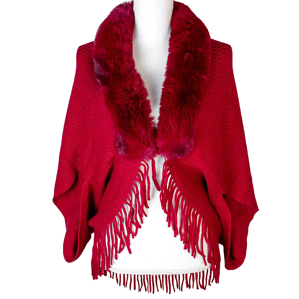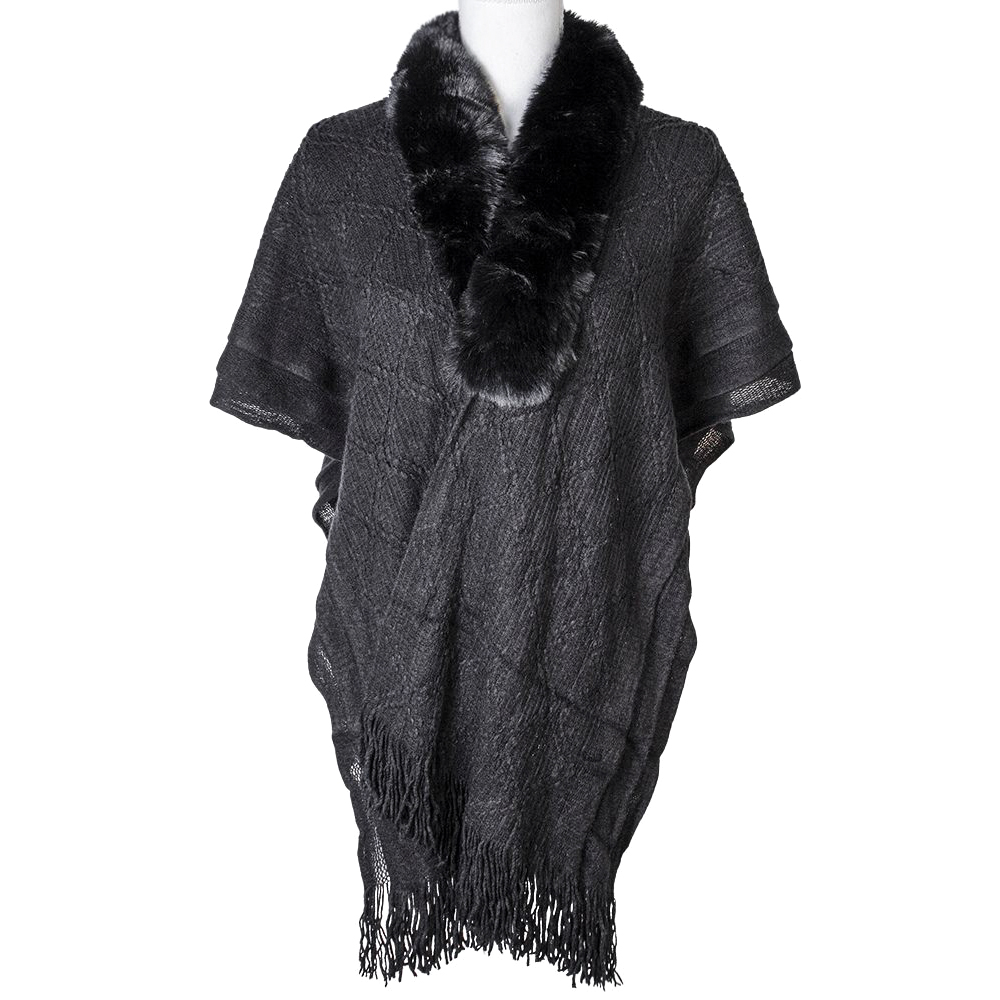 PLAID PONCHO WITH FAUX FUR TRIM & FRINGE