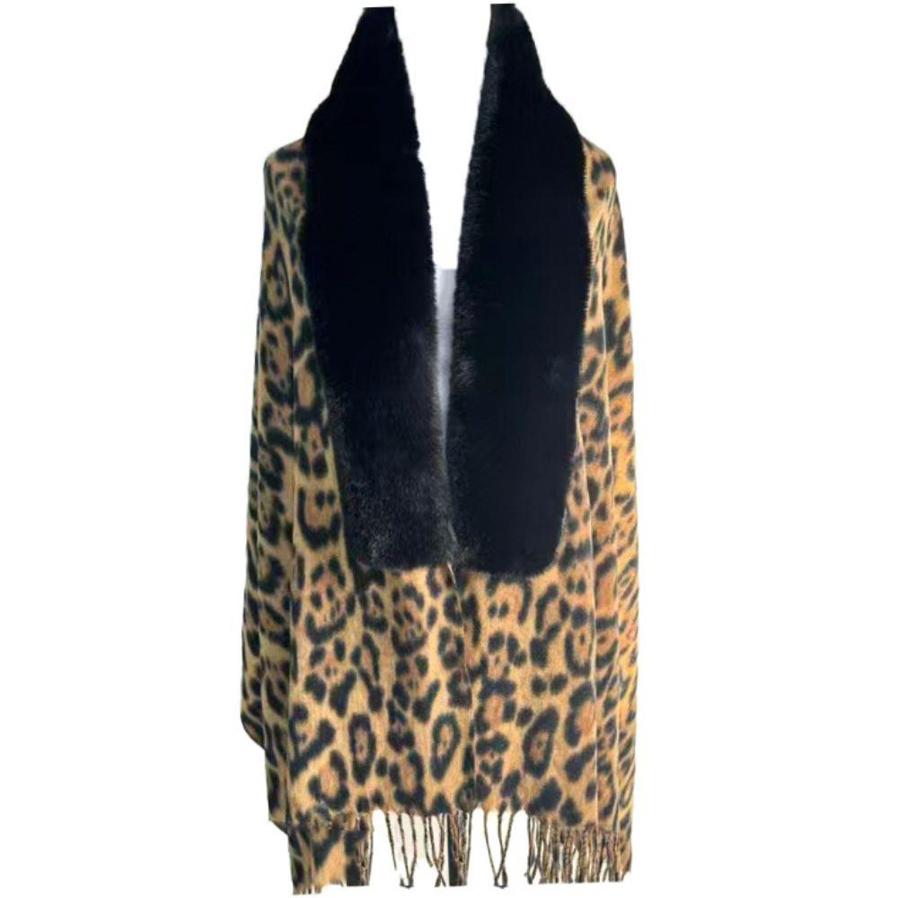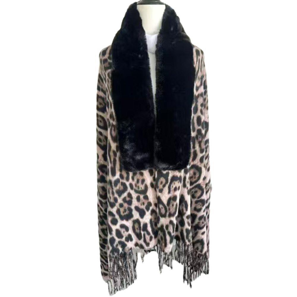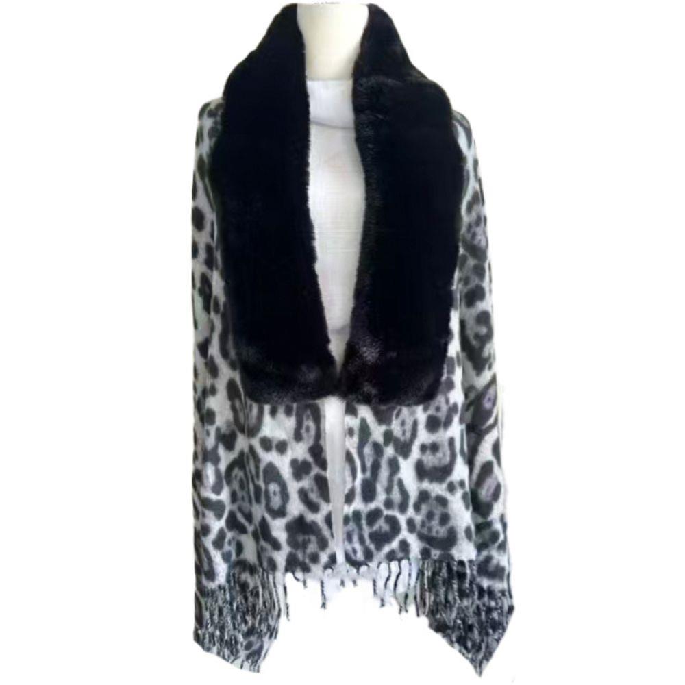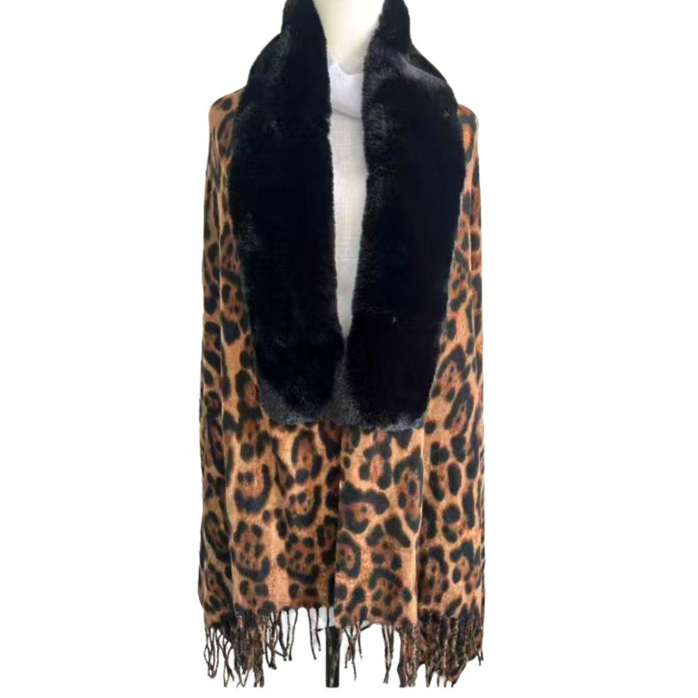 FAUX FUR TRIM LEOPARD PATTERN FRINGE EDGE KNIT SHAWL