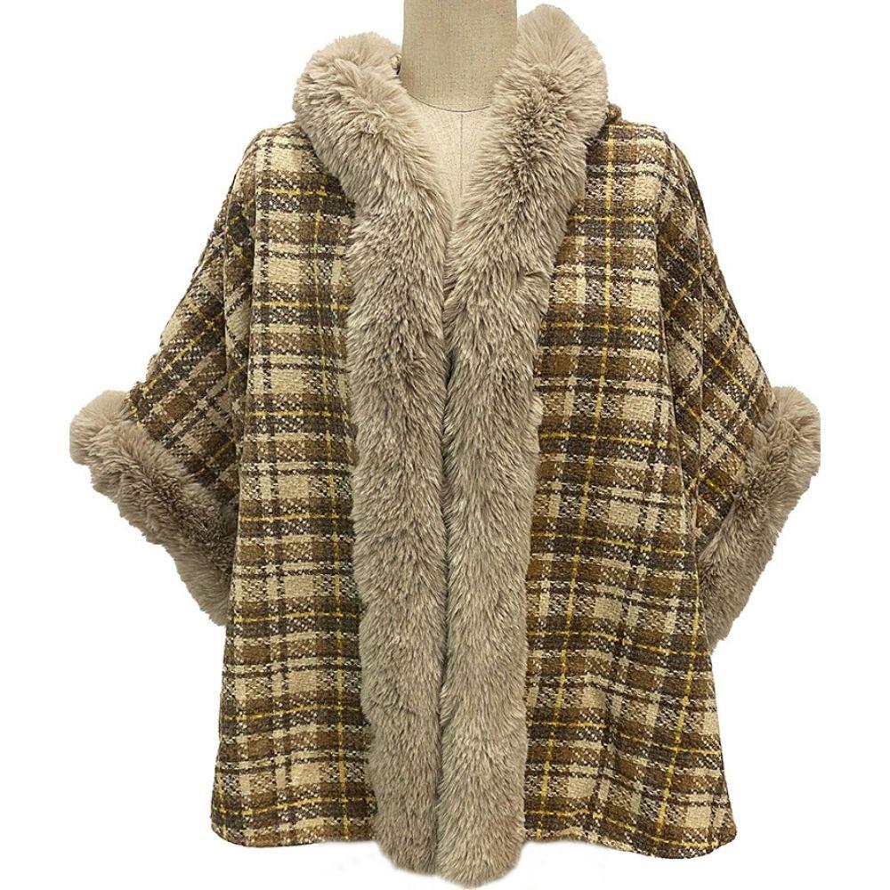 PLAID PATTERN FAUX FUR COLLAR PONCHO