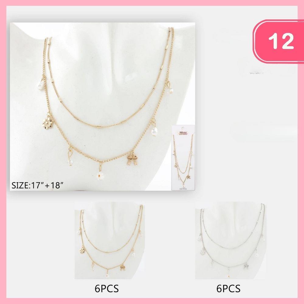 LAYERED FLOWER BOW PEARL CHARM NECKLACE (12 UNITS)