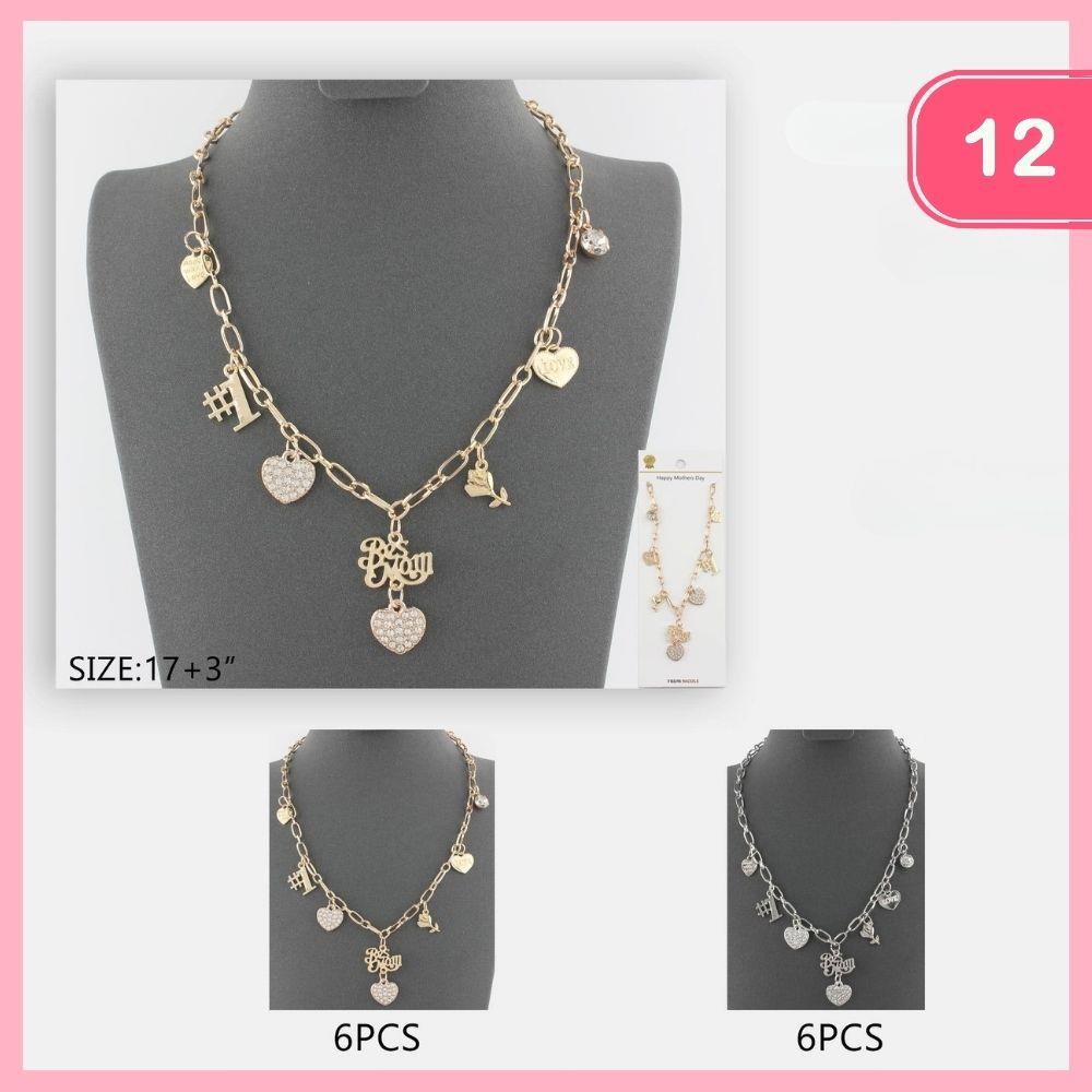LAYERED RHINESTONE HEART MOM PENDANT NECKLACE (12 UNITS)