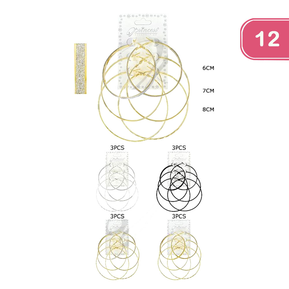 FASHION METAL GLITTER HOOP EARRING 3 PC SET (12 UNITS)