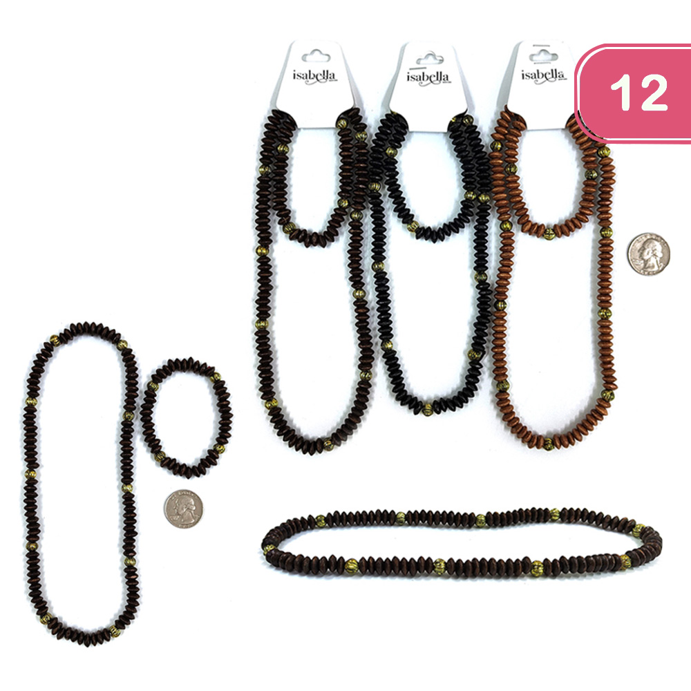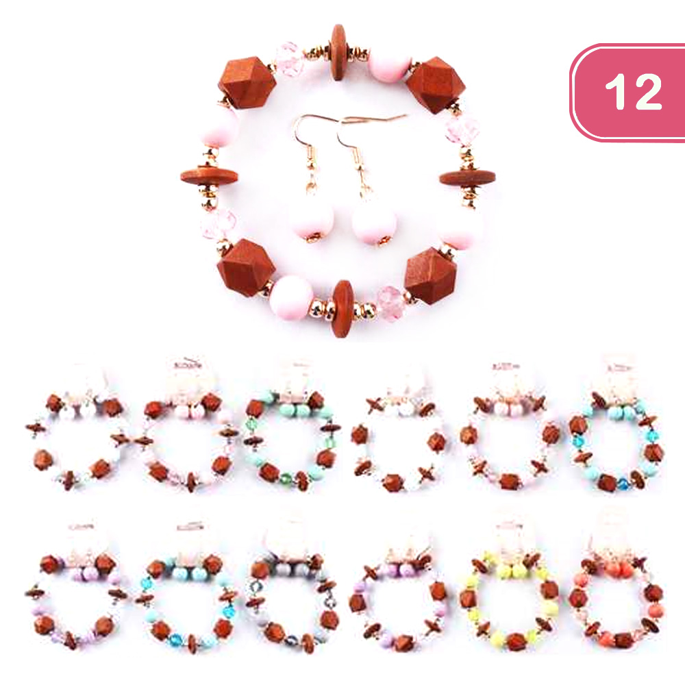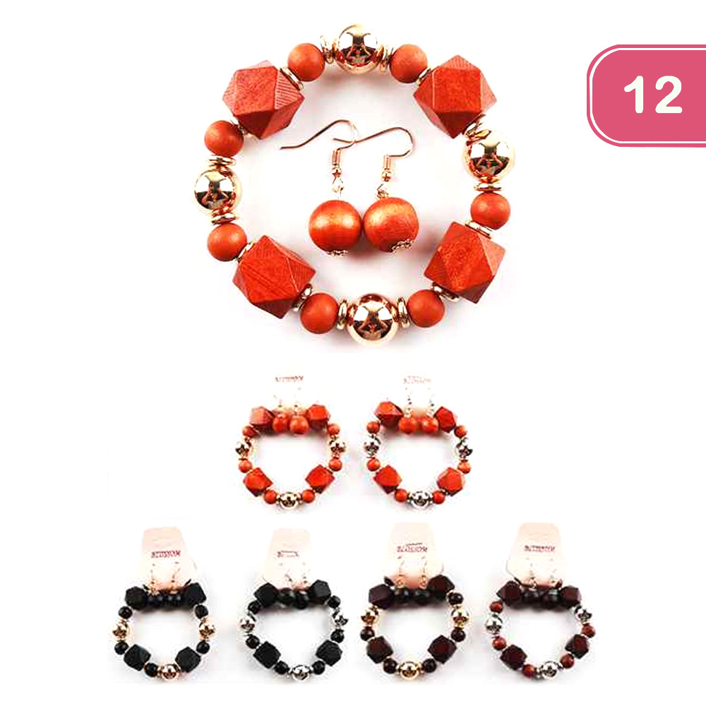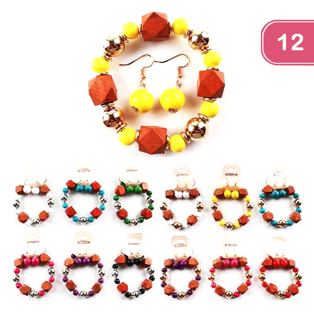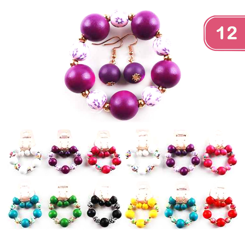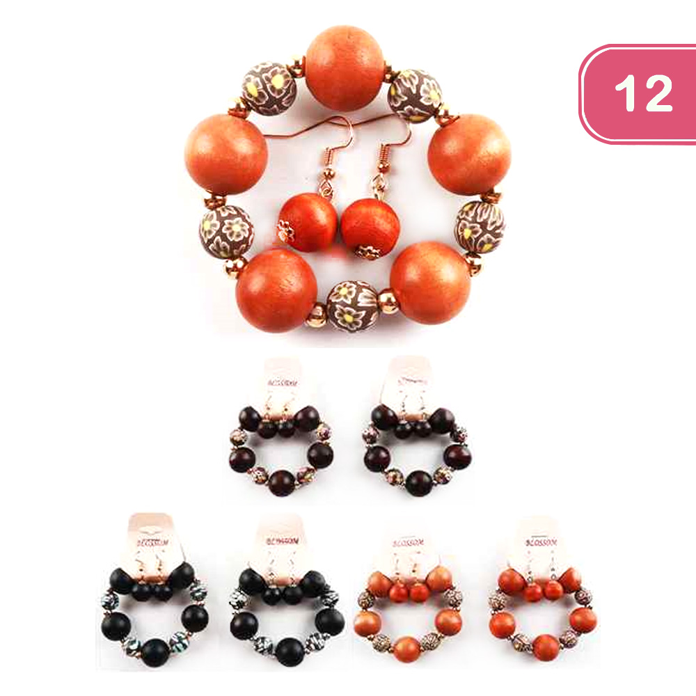 FASHION WOODEN BEAD EARRING BRACELET SET (12 UNITS)