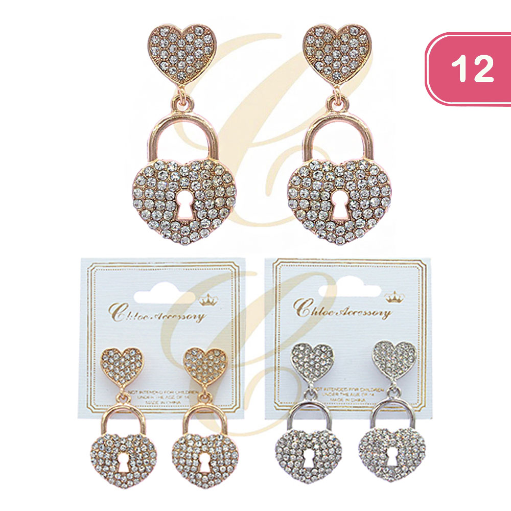 FASHION RHINESTONE LOVE LOCK CHARM DANGLE EARRING (12 UNITS)