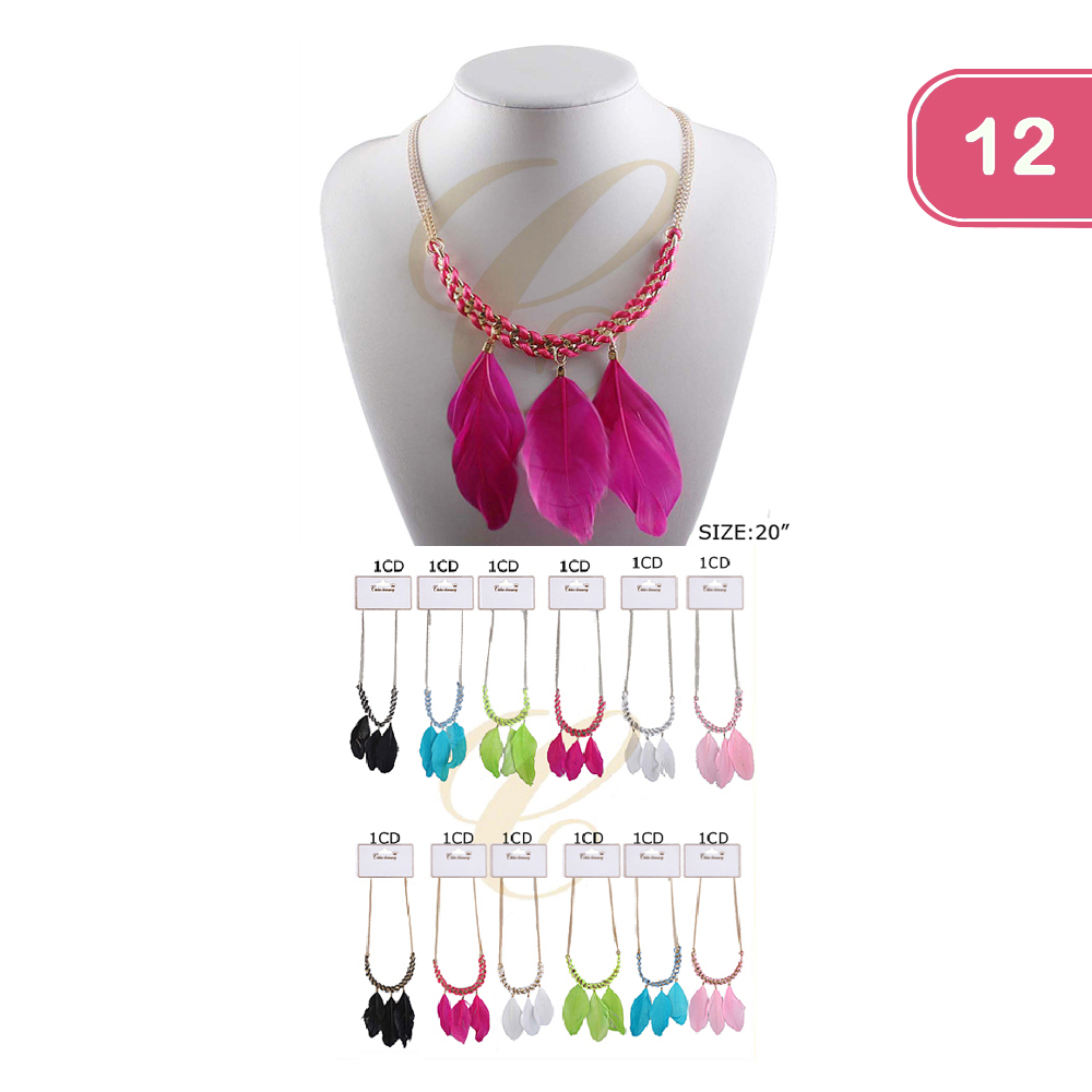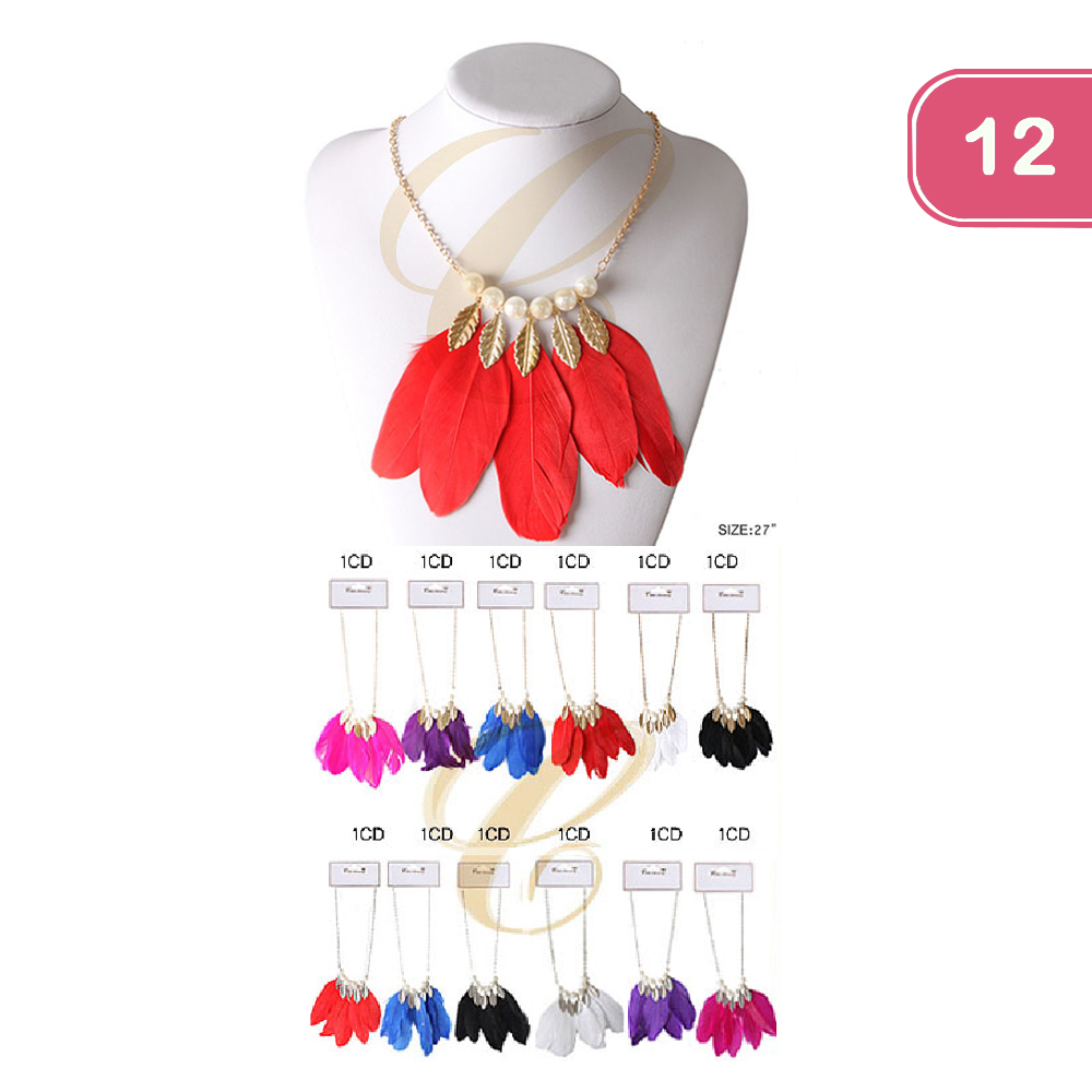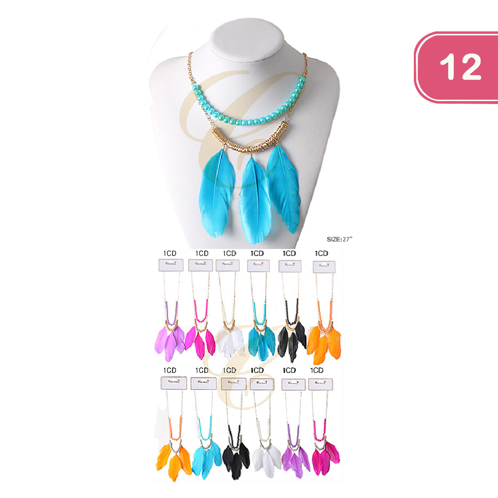 FASHION BEADED DANGLE FEATHER NECKLACE (12UNITS)