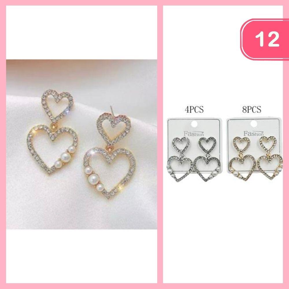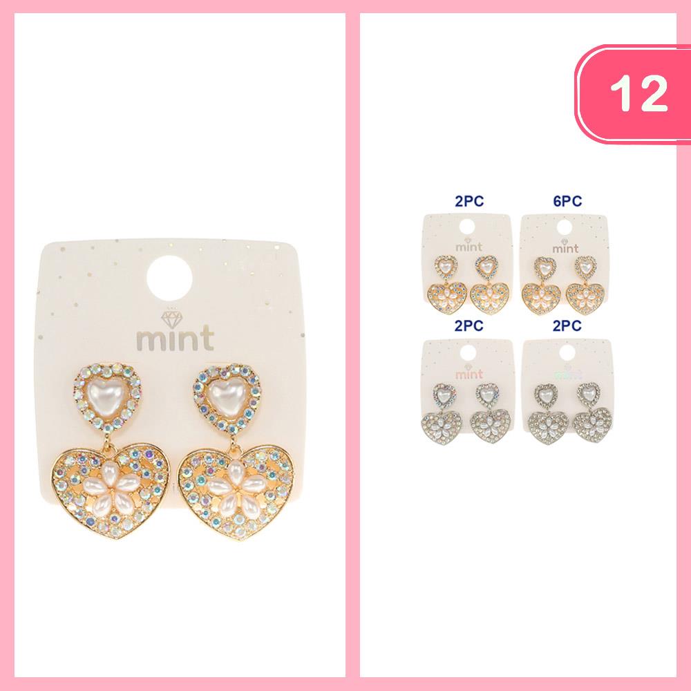 RHINESTONE PEARL HEART DANGLE EARRINGS (12 UNITS)
