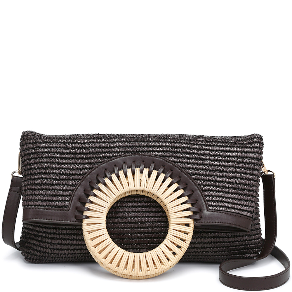 FAUX STRAW HALF-MOON CLUTCH WITH SHELL EMBELLISHMENTS