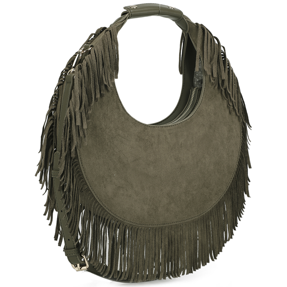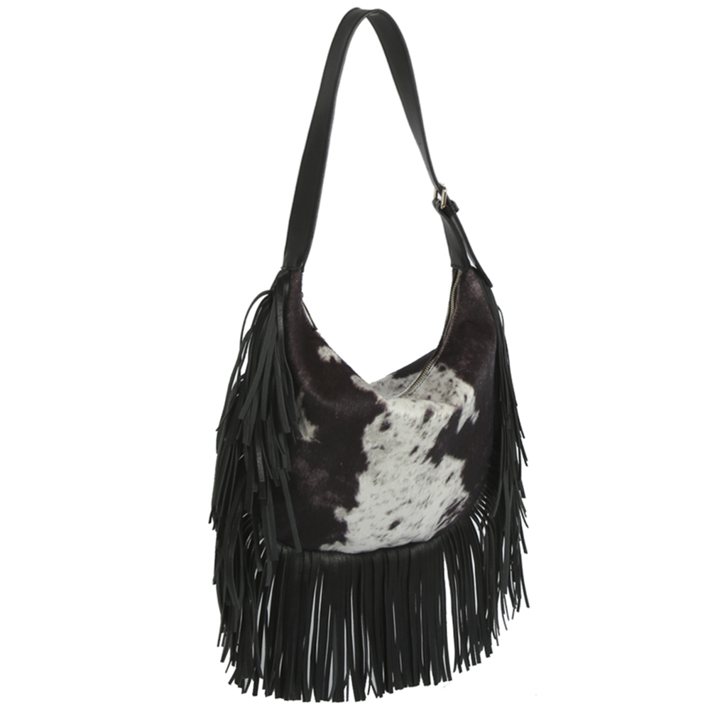 COW TEXTURED FRINGE SHOULDER HOBO BAG