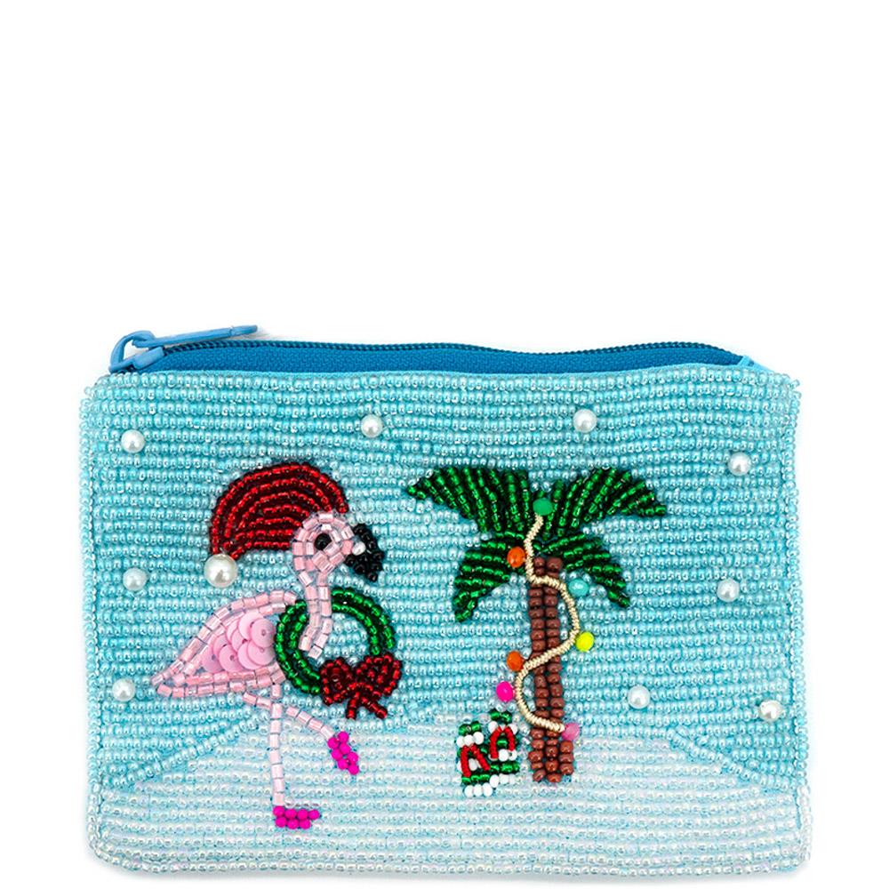 CHRISTMAS SEED BEAD FLAMINGO PALM TREE ZIPPER COIN PURSE BAG