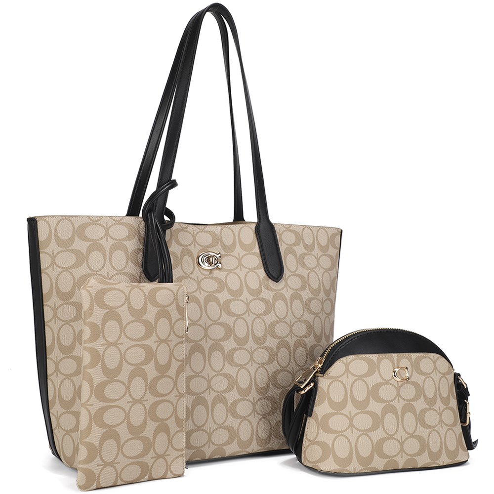 3IN1 OVAL PATTERN PRINT SHOULDER TOTE BAG W CROSSBODY AND WALLET SET