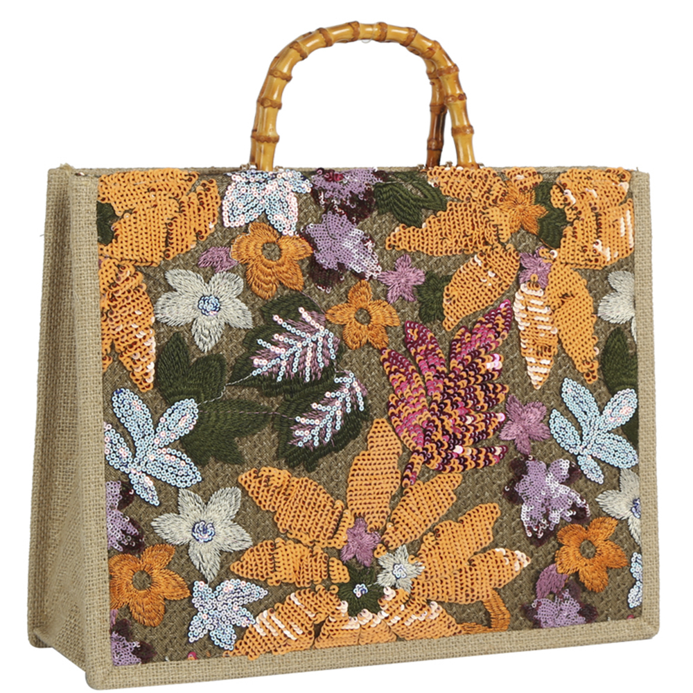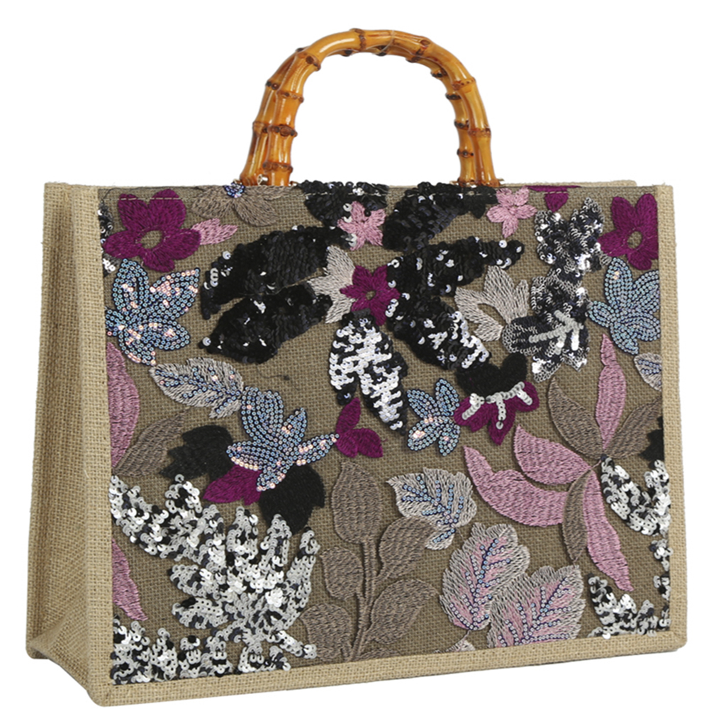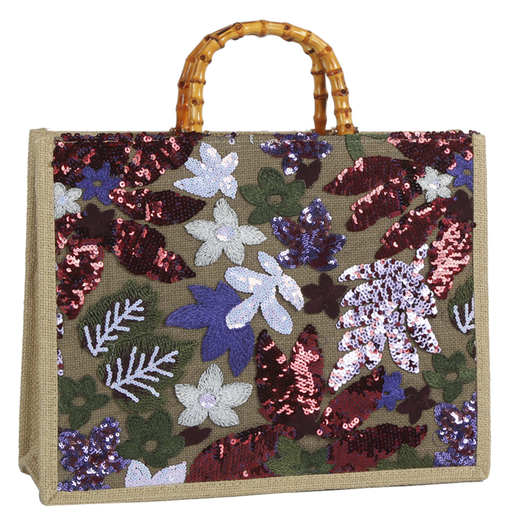 LEAF AND FLOWER DESIGN HANDLE TOTE BAG