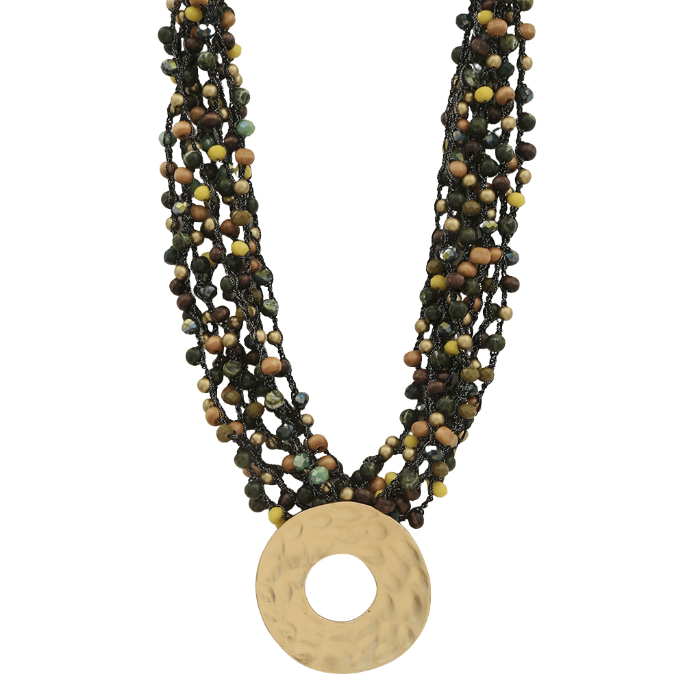 MULTI COLORED BEAD CIRCULAR TEXTURED METAL PENDANT NECKLACE