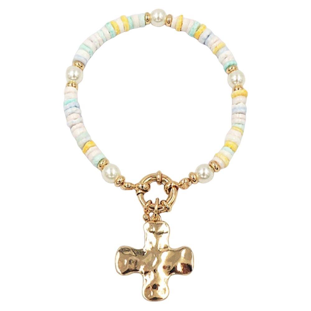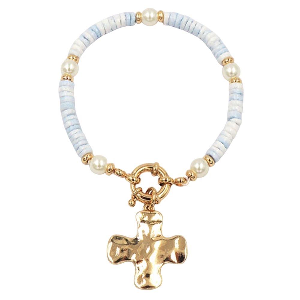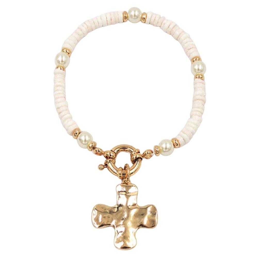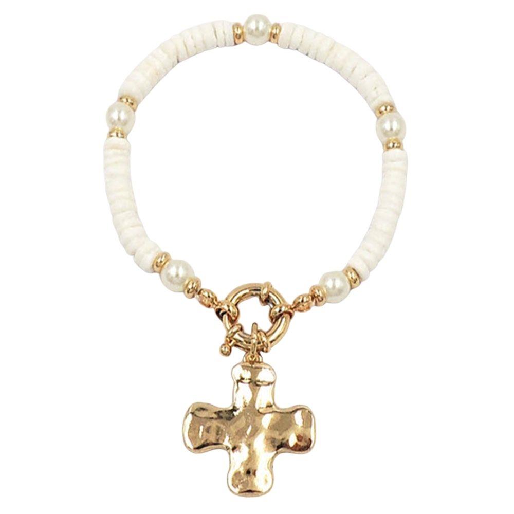 CROSS CHARM CCB & PEARL STRETCH BRACELET