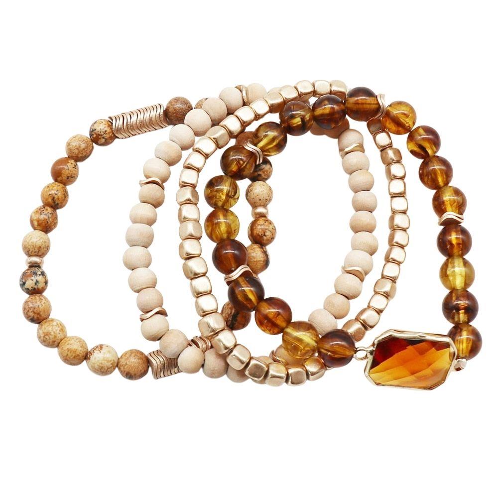 WOOD METAL BALL BEAD STRETCH BRACELET SET