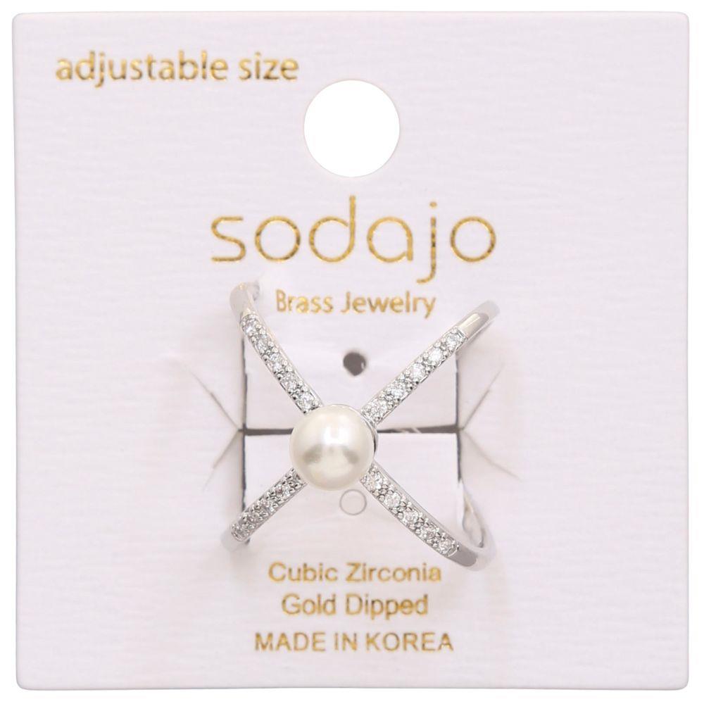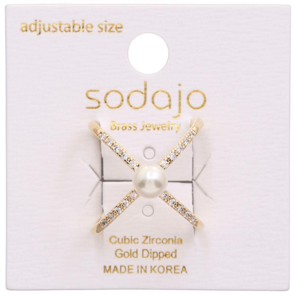 SODAJO PEARL BEAD CZ CRISS CROSS GOLD DIPPED ADJUSTABLE RING