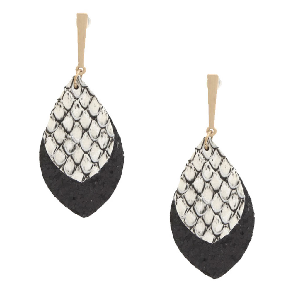TRENDY GENUINE LEATHER ANIMAL SKIN TEXTURED LEAF DROP EARRING