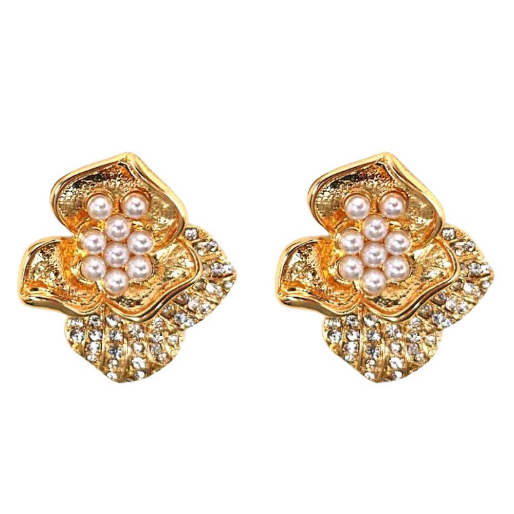 PEARL BEAD RHINESTONE FLOWER METAL EARRING