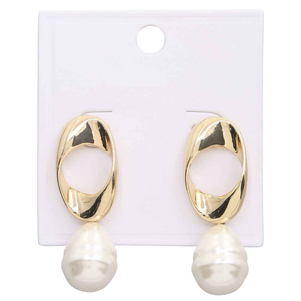 BENT OVAL METAL PEARL BEAD DANGLE EARRING
