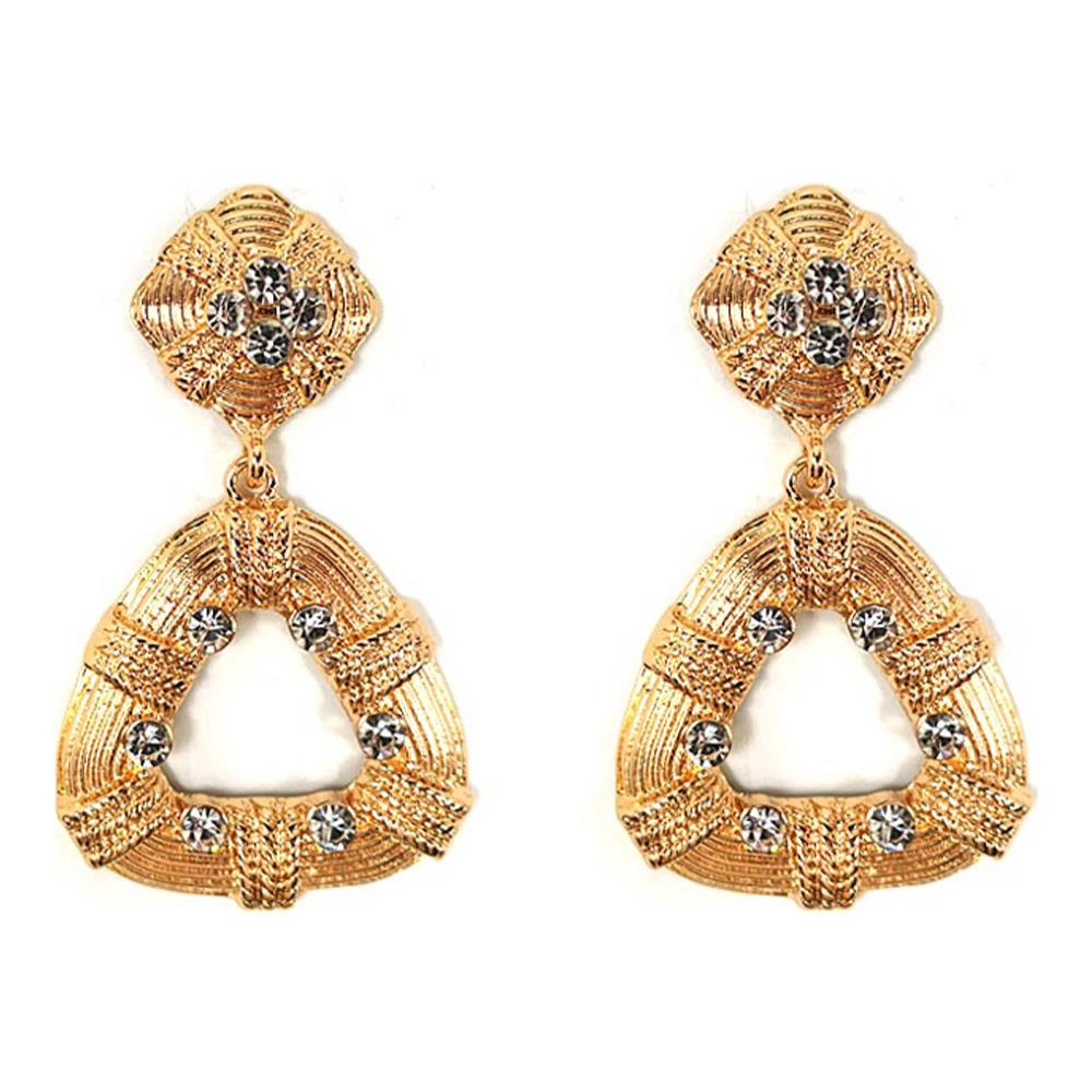 TEXTURED METAL RHINESTONE TRIANGLE DANGLE EARRING