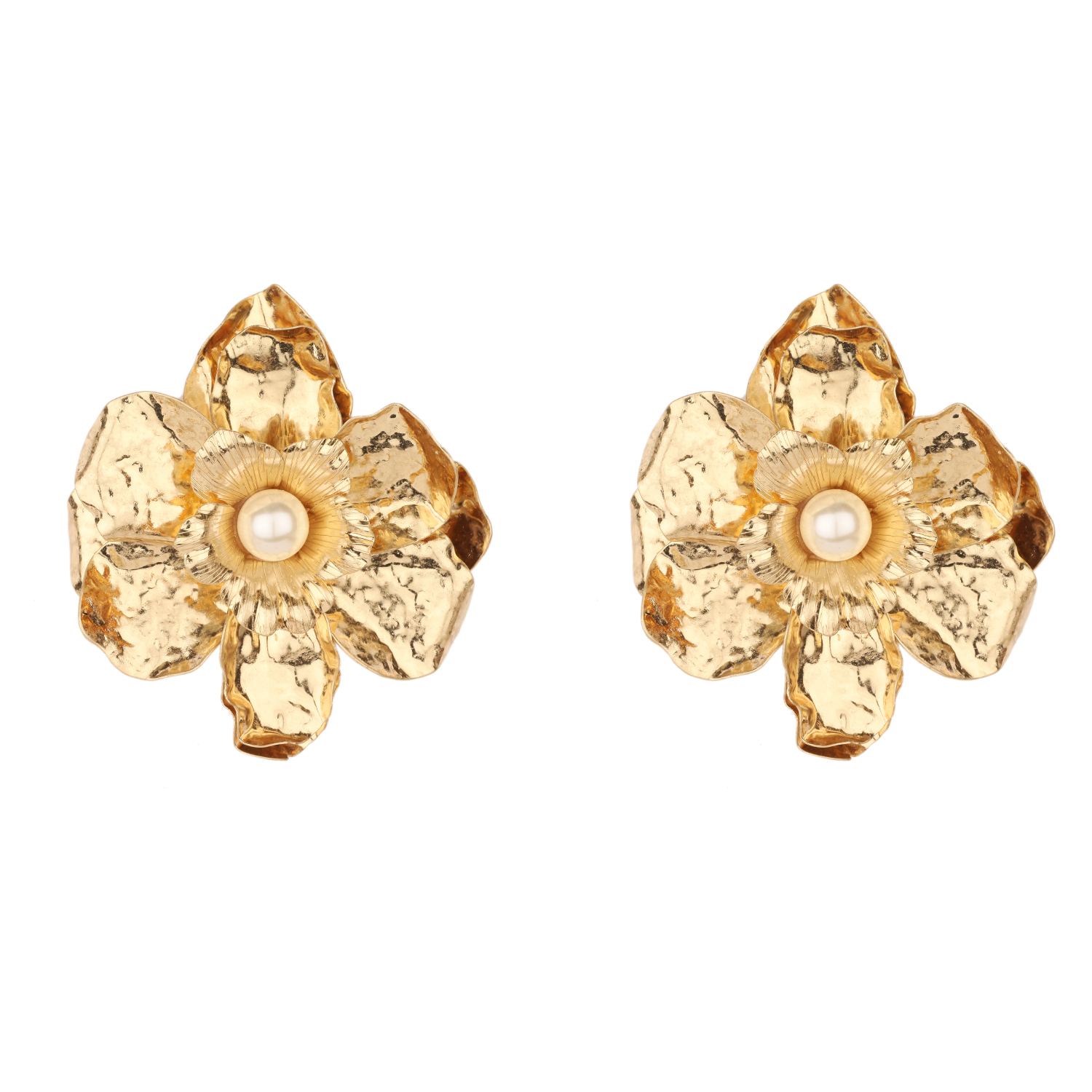 HAMMERED FLOWER W CENTER PEARL EARRINGS