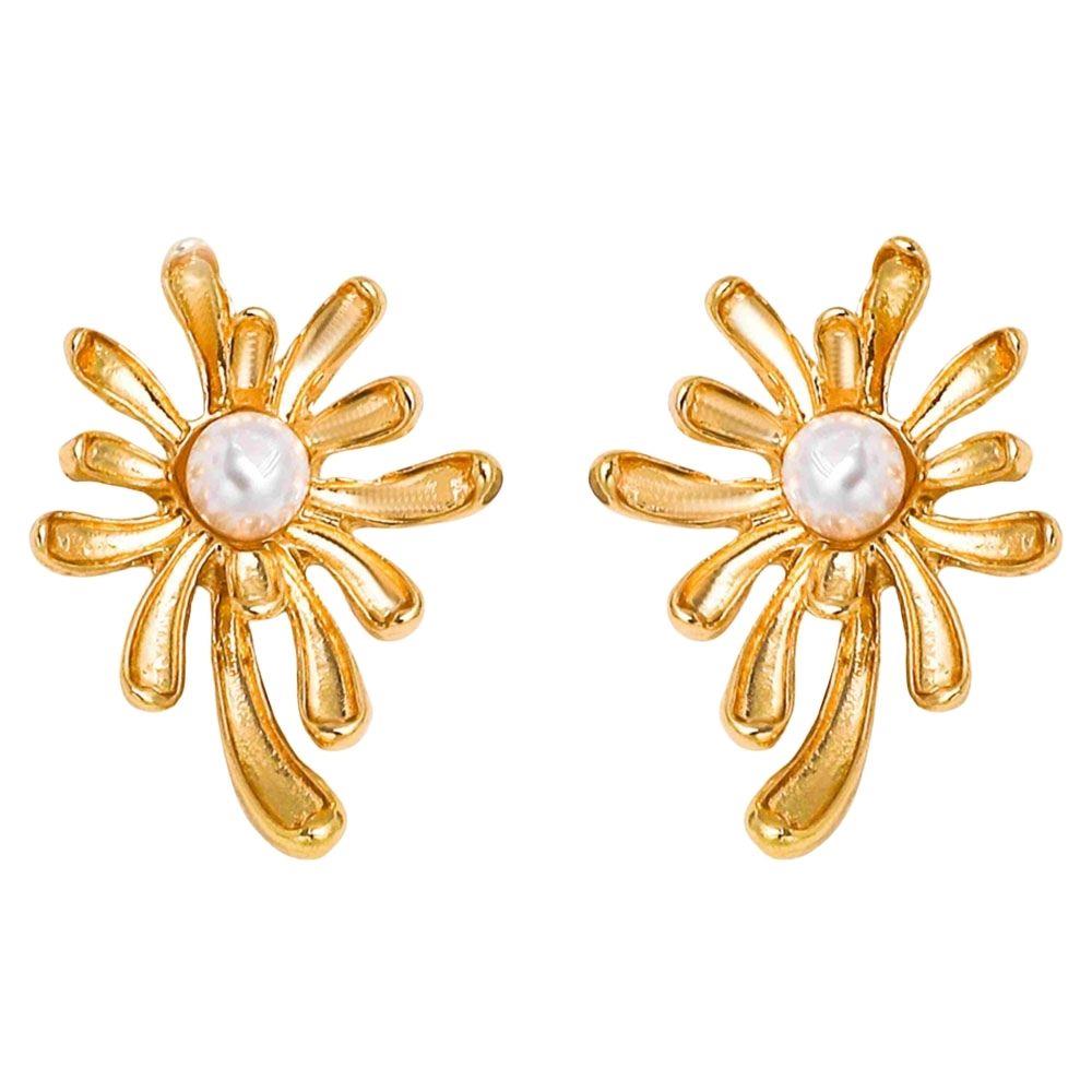 METAL FLOWER PEARL CENTER STATEMENT STUD EARRING