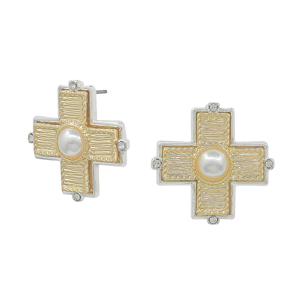 TEXTURED METAL CROSS MOTHER OF PEARL ACCENT POST EARRINGS