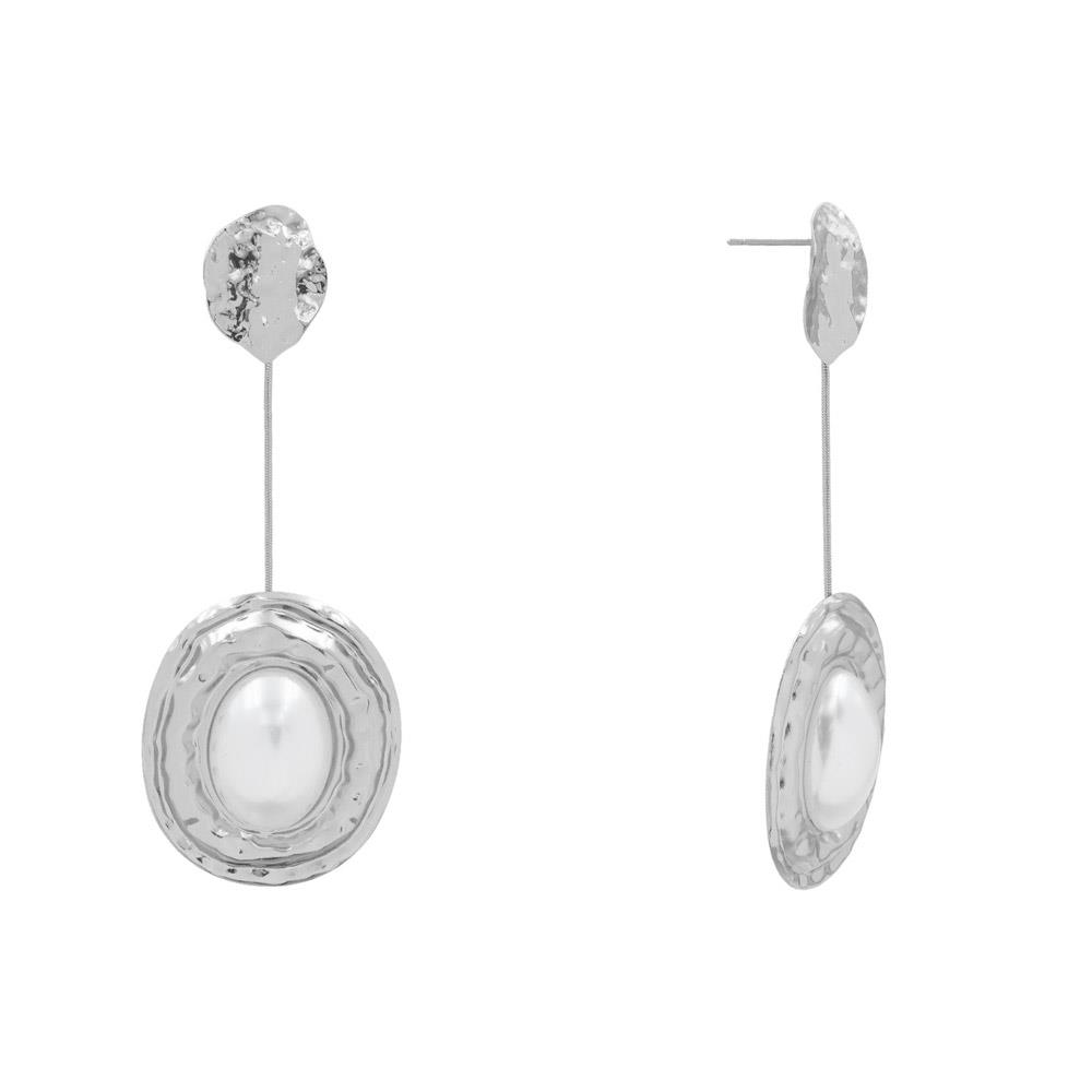HAMMERED METAL OVAL PEARL BEAD EARRING