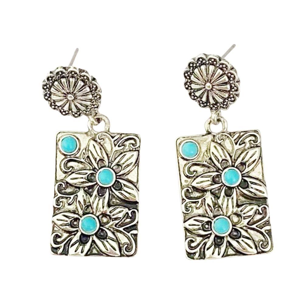 WESTERN TEXTURED METAL FLORAL RECTANGLE DANGLE EARRINGS