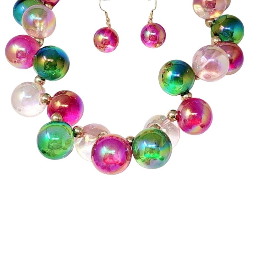 IRIDESCENT TEARDROP BEAD BIB STATEMENT NECKLACE EARRING SET