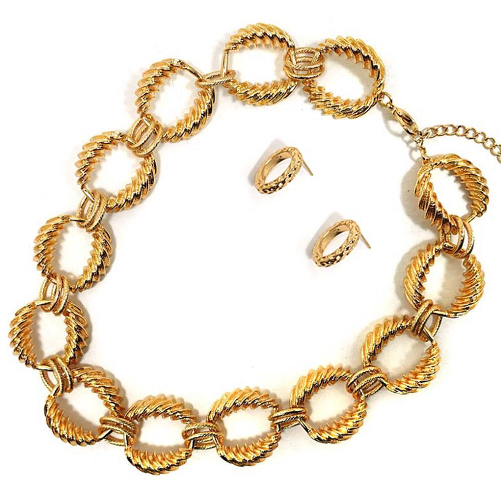TEXTURED METAL LARGE ROUND LINK NECKLACE EARRING SET