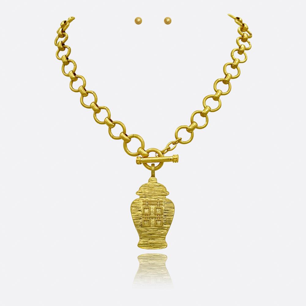 TEXTURED METAL PENDANT CHAIN NECKLACE EARRING SET