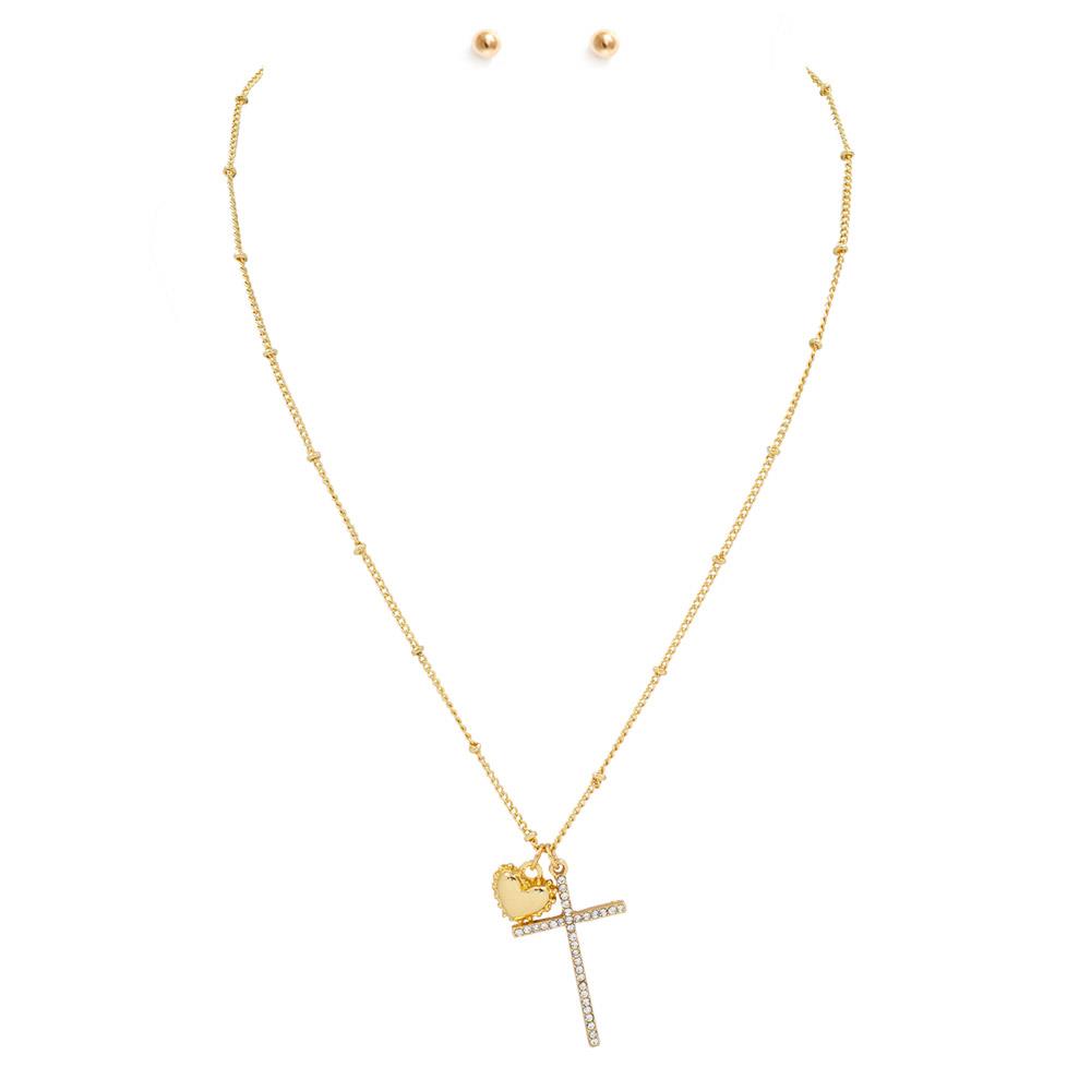 METAL HEART RHINESTONE CROSS PENDANT NECKLACE