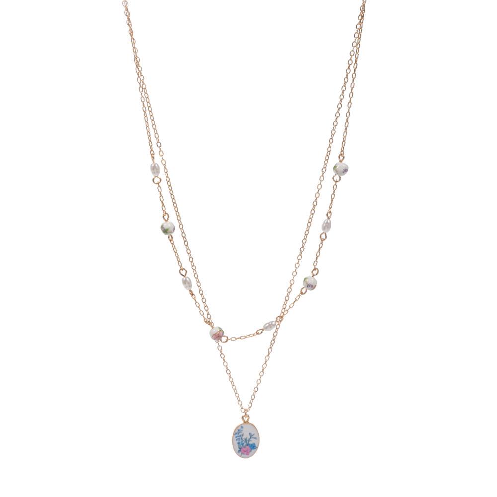 OVAL SHAPED PATTERN PRINTED ENAMELED CHARM NECKLACE