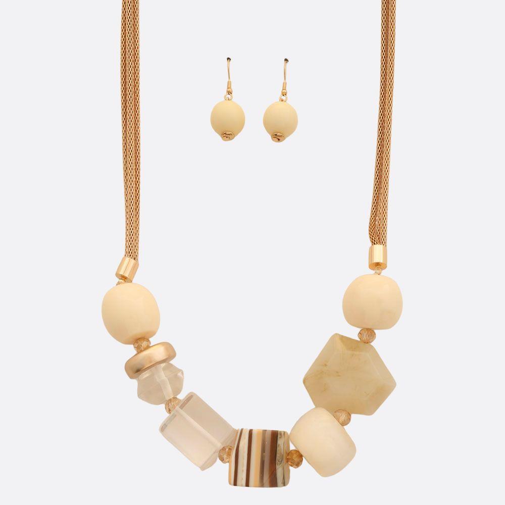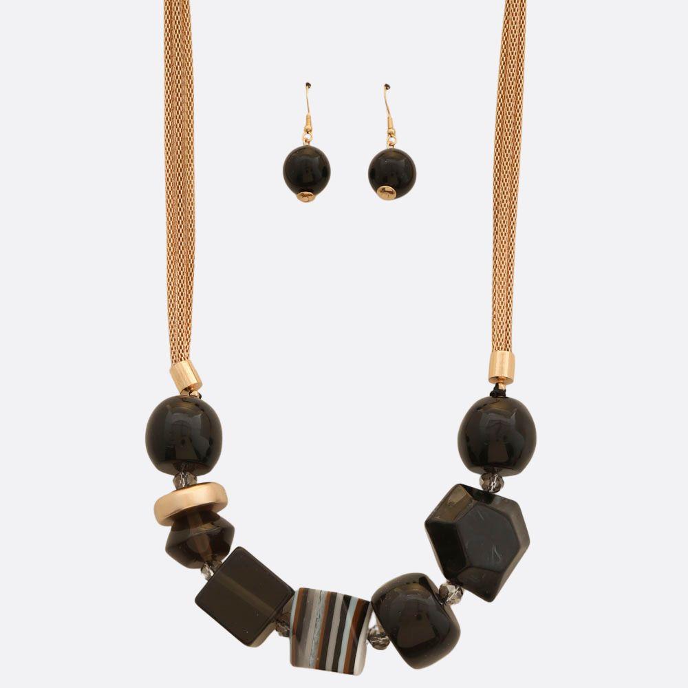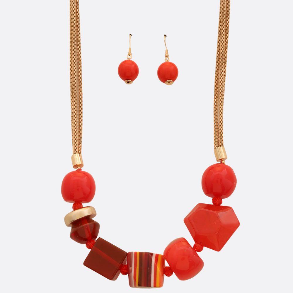 RESIN ROUND PENDANT CORD LONG NECKLACE EARRING SET