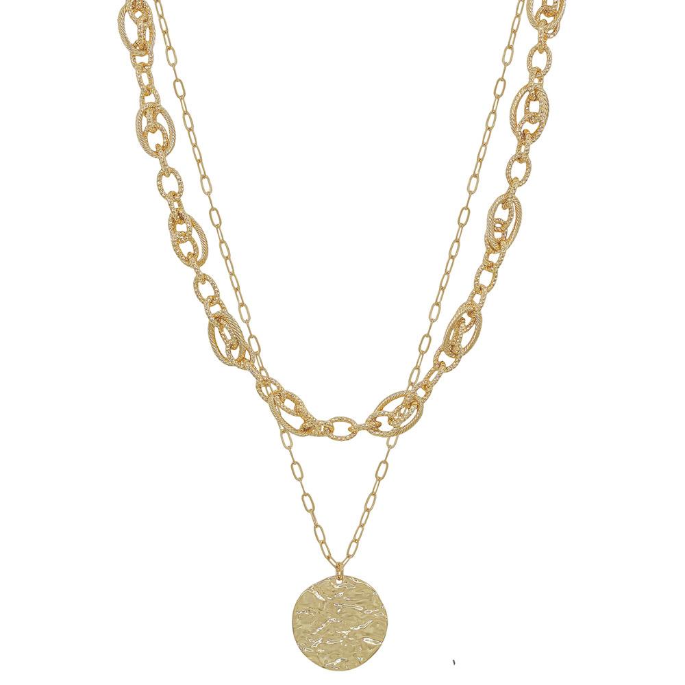 2 LAYERED LINKED TEXTURED METAL OVAL CHAIN COIN PENDANT SHORT NECKLACE
