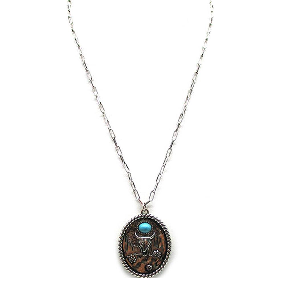 COWBOY CATTLE HEAD CHARM OVAL PENDANT NECKLACE