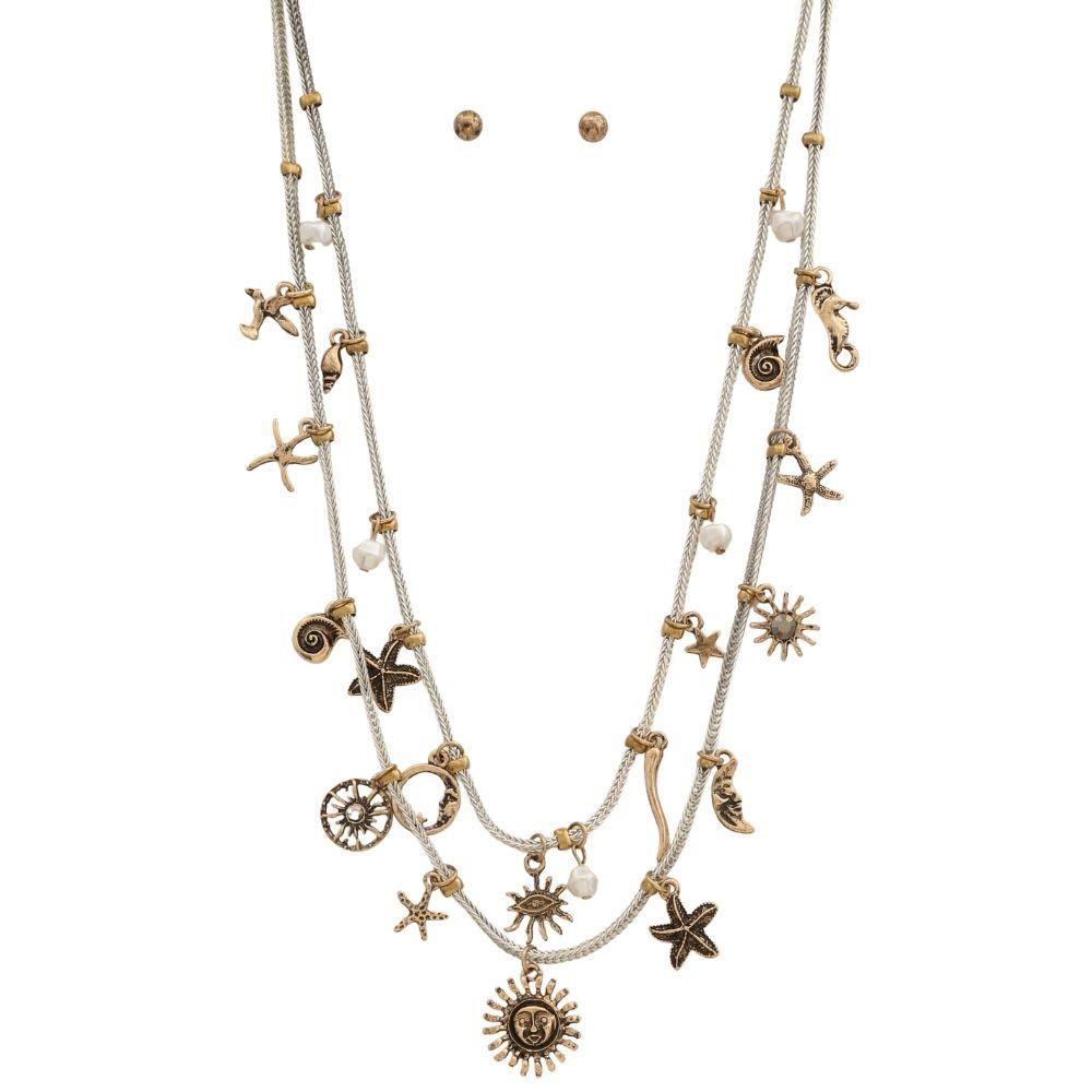 SUN STAR MULTI CHARM PEARL BEAD LAYERED NECKLACE