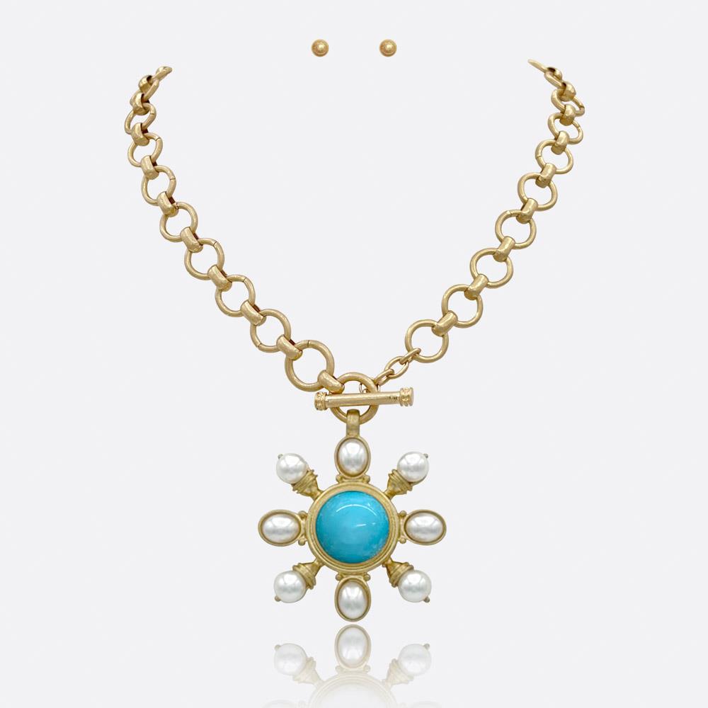 PEARL TQ STONE PENDANT CHAIN NECKLACE EARRING SET